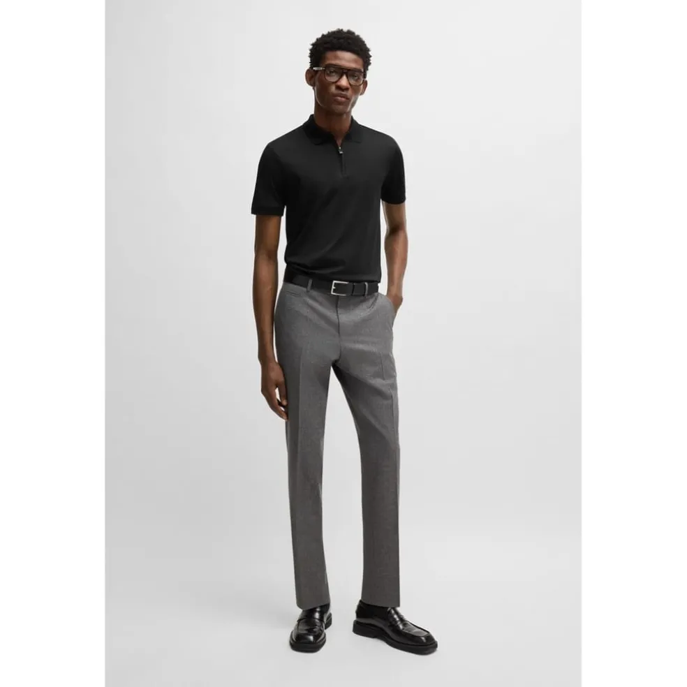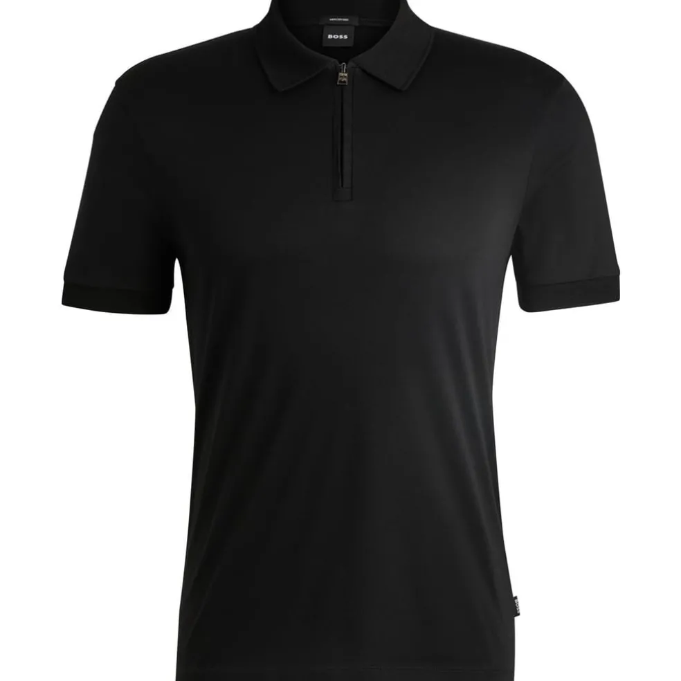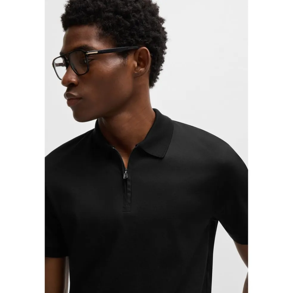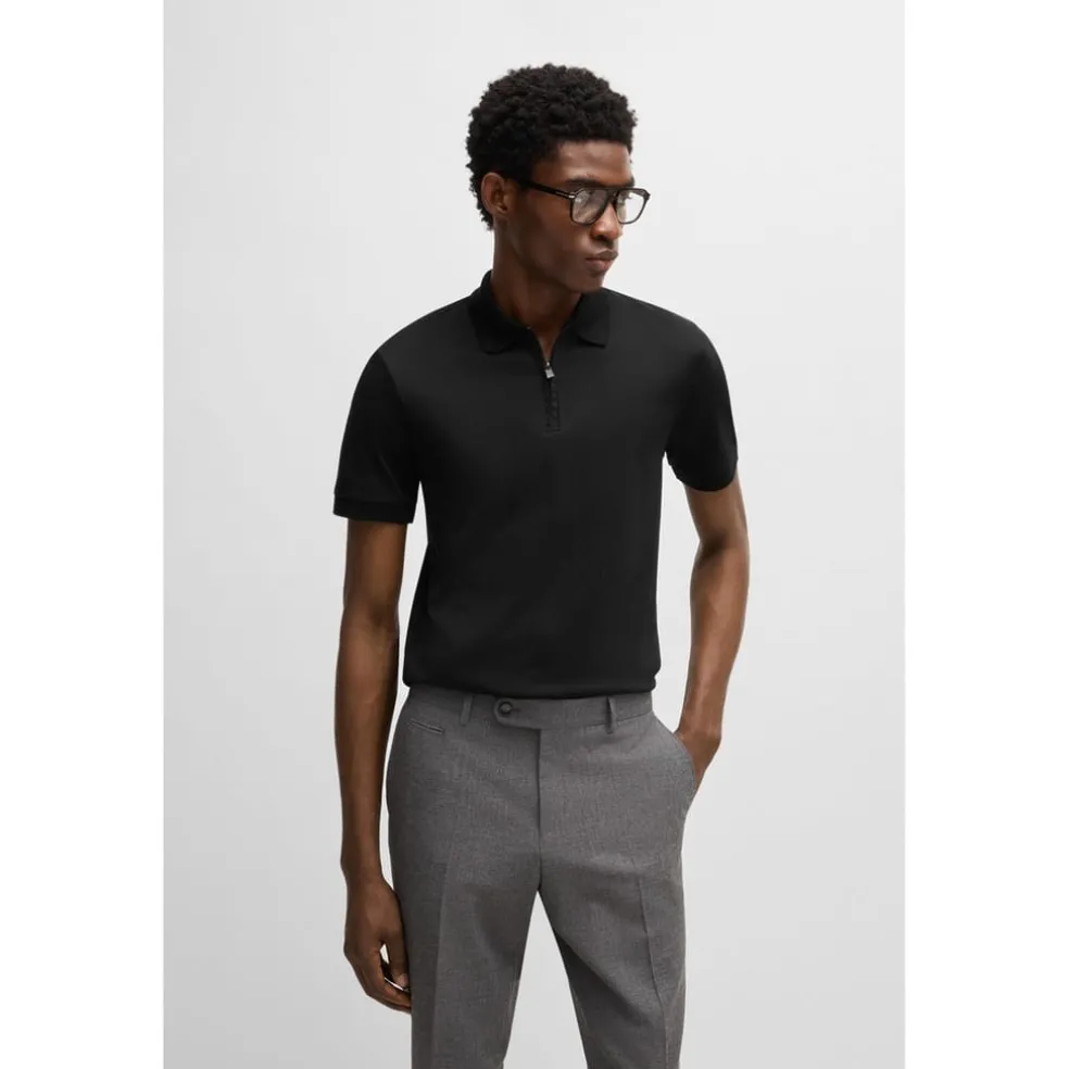 This Boss top is a semi-formal essential, featuring a polo collar and short sleeves. Crafted in a solid pattern, it offers a regular fit for comfort. The top is adorned with a subtle logo embellishment, adding a touch of brand identity. A practical zipper closure completes the design, making it a versatile choice for various occasions.