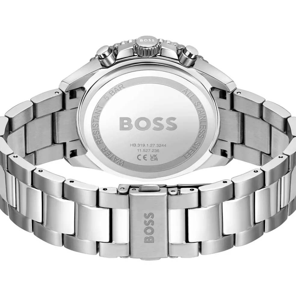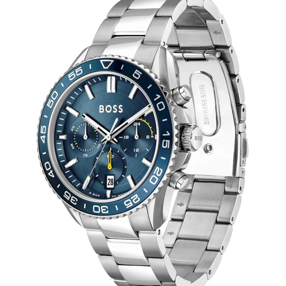 – A 43mm stainless steel case, blue dial, stainless steel bracelet. Water resistant to 5 ATM.