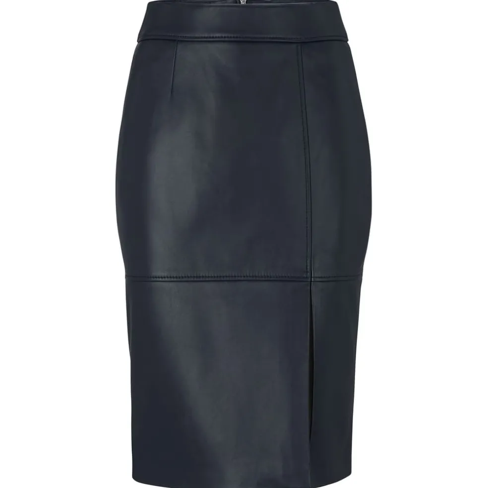 An elegant pencil skirt crafted in soft leather by BOSS Womenswear cut to a defined fit with a front slit and panel details. We continuously look for more responsible ways to produce and finish our products. A minimum of 60% of the leather used to make this product has been sourced from certified tanneries.
