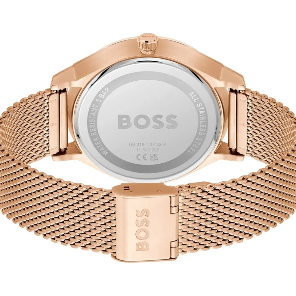 – A 43mm carnation gold IP case, black dial with polished accents, carnation gold IP mesh bracelet. Water resistant to 5ATM.