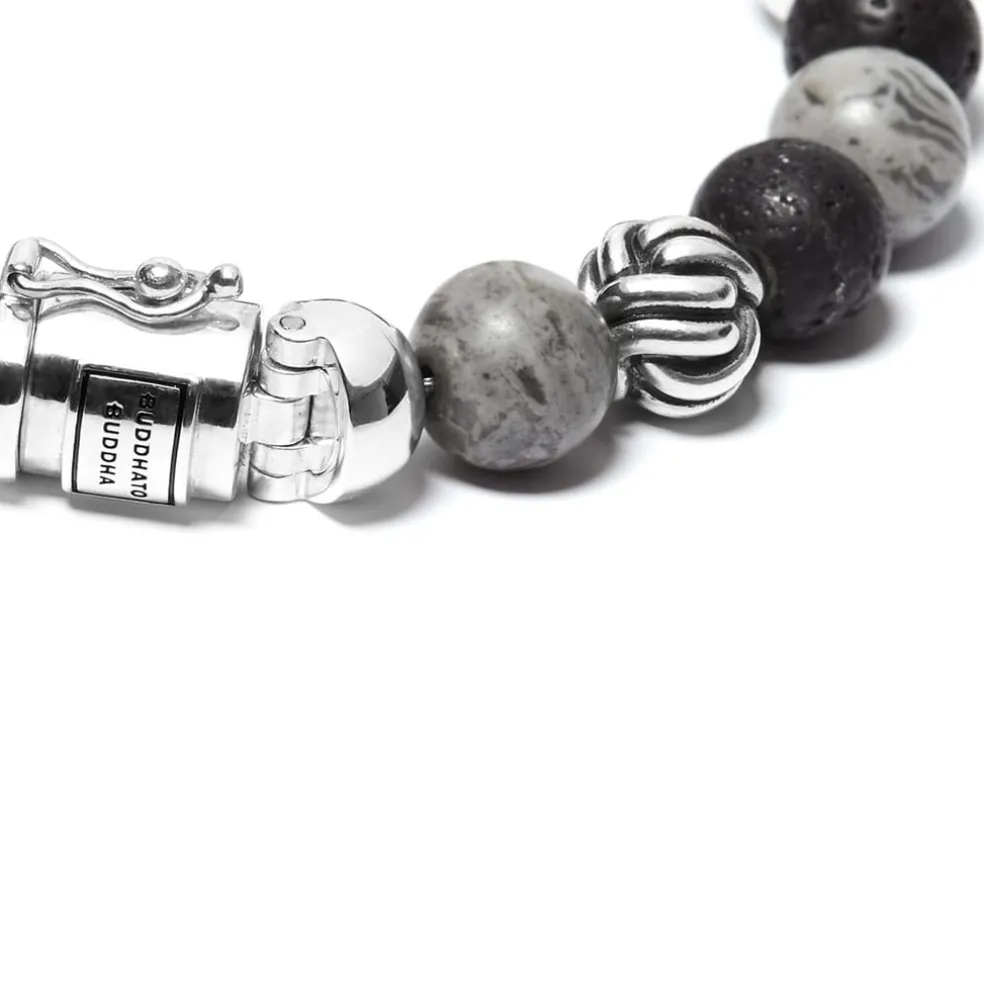 – The Spirit Bead Mix Grey Picasso Jasper bracelet is based on prayer beads and was translated into a Buddha to Buddha design with its iconic sterling silver lock. We love the gemstone beads for their beauty and spiritual meaning. This bracelet has Grey Picasso Jasper stones alternated with black lava stones. Jasper has strong grounding and calming qualities that help to encourage strength and self-discipline and lava stones calms the emotions. The bracelet is handmade and timeless like all our jewellery and easily combines with leather or silver pieces.