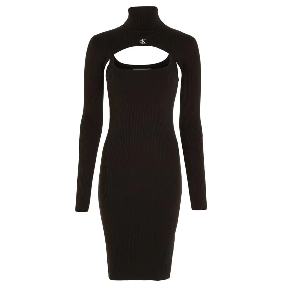 Get ready to elevate your stylish ensemble with the 2-in-1 Roll Neck Jumper Dress from Calvin Klein Jeans. Whether you are attending a chic brunch or heading out with friends, the 2-in-1 Roll Neck Jumper Dress offers an air of timeless sophistication that can effortlessly transition from day to evening. Crafted from organic cotton with a luxurious stretch knit, this dress offers both comfort and elegance. Admire the ingenuity of the 2-in-1 design, where the pieces can be detached and worn separately for versatile looks. With a slim fit and a ribbed texture, this dress effortlessly flatters the silhouette, creating a refined and sophisticated aesthetic. The roll neckline and long sleeves add a touch of elegance, keeping you stylishly warm during the cooler months. Designed in a solid black colourway, this dress offers a timeless charm, making it a suitable choice for various occasions. To complete the design, the iconic Calvin Klein embroidered logo sits proudly on the chest as a testa