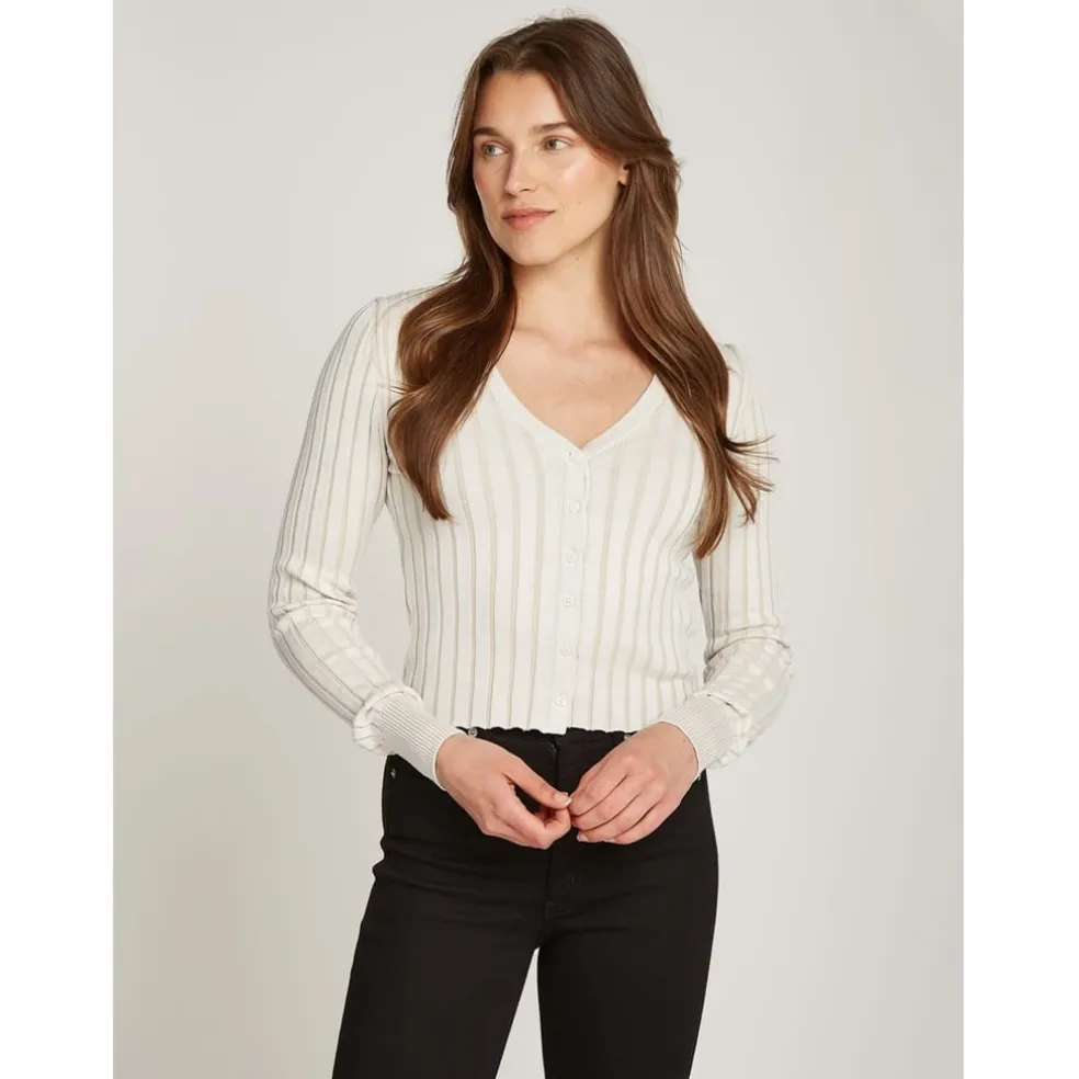 Discover this Calvin Klein Jeans cardigan sweater, a timeless addition to any wardrobe. Featuring a ribbed pattern and crafted in a regular fit, this sweater is designed for comfort and style. The V-neck design along with its ribbed cuffs and button closure completes the look, offering a sophisticated touch. Perfect for those seeking a versatile top with long sleeves.