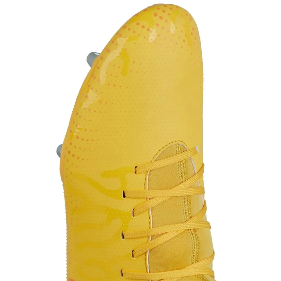 – Embracing a tighter fit for minimal energy loss, these rugby boots are ideal for those seeking speed and agility during those tough games. Designed for soft ground surfaces, the 6 conical metal and 3 rhombus TPU studs provide unmatched stability so you can step into the game with confidence. Feel the precision with the upper grip texture for perfect kicks, while the full lace fastening ensures a secure fit each time. Signed off with a striking pattern all-over, this pair are designed to ignite your passion on the field.