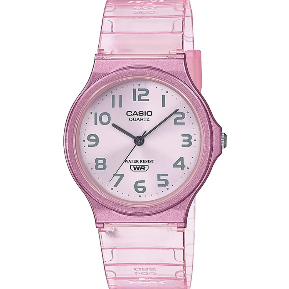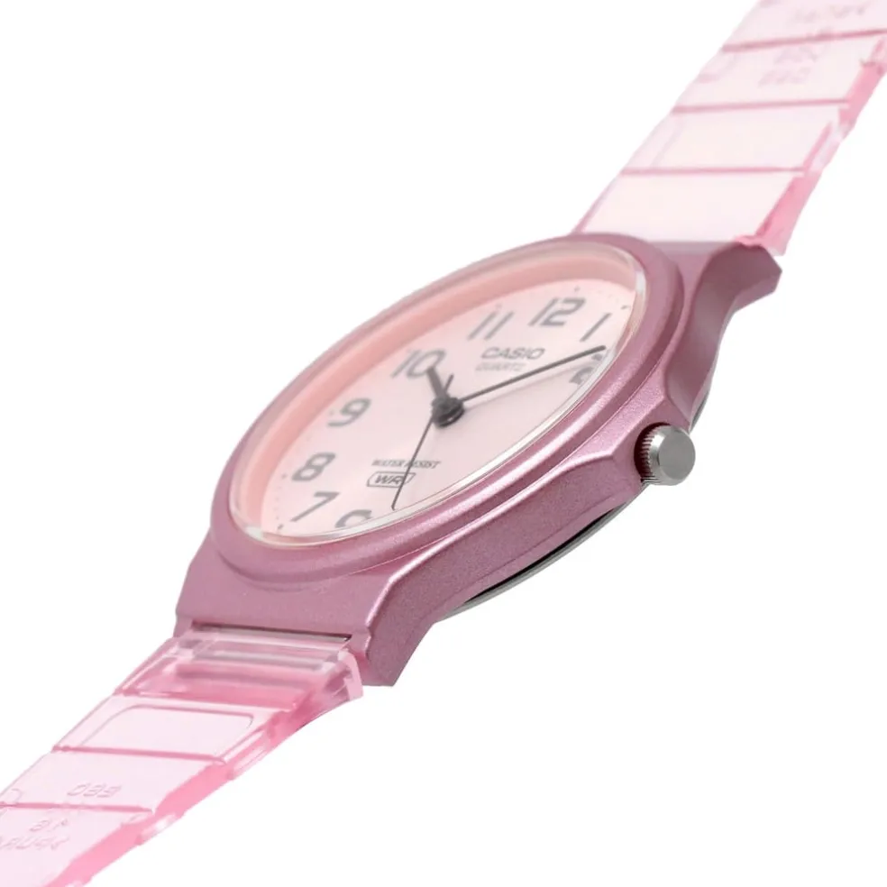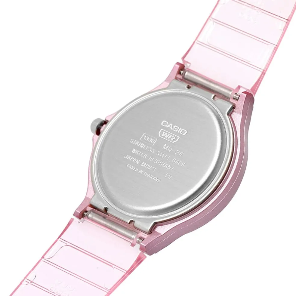 The best-selling MQ-24 is back in colourful translucent designs! This watch features a metallic case, sunburst-finish dial and band that come together in harmonized monochromatic colour. A simple design with basic hour, minute and second hands, water resistance for daily use and a lightweight, comfortable fit.