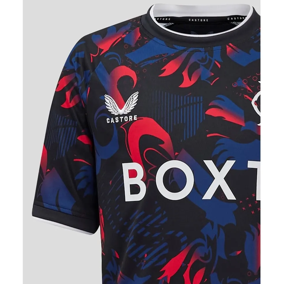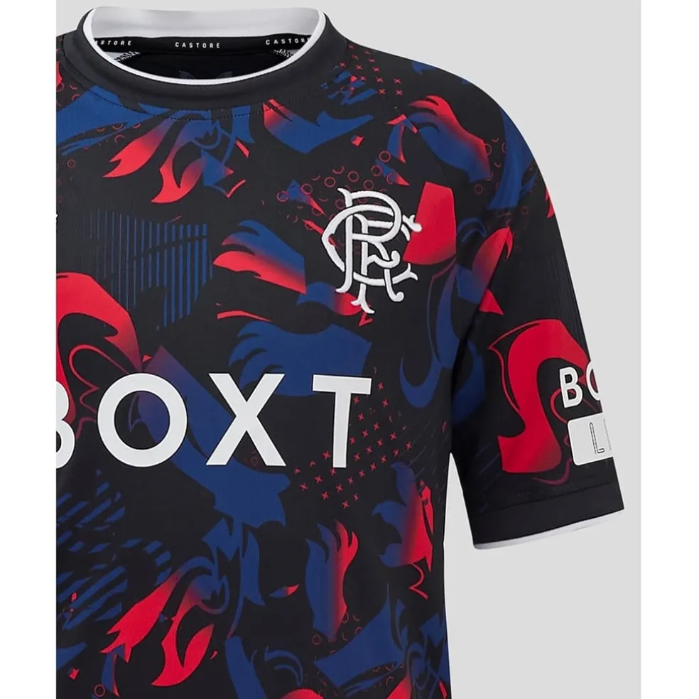 – The intricate piping along the front arm side body seam and the bold printed repeat pattern on the front body showcase attention to detail and design prowess. Adorned with the esteemed Rangers crest on the left chest and Castore branding on the right, this shirt is more than apparel, it’s a symbol of pride for the Rangers football club.
