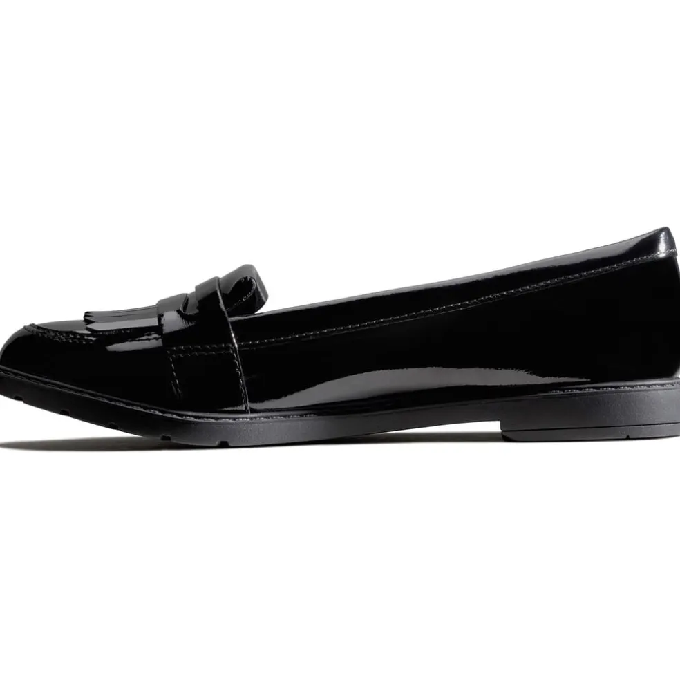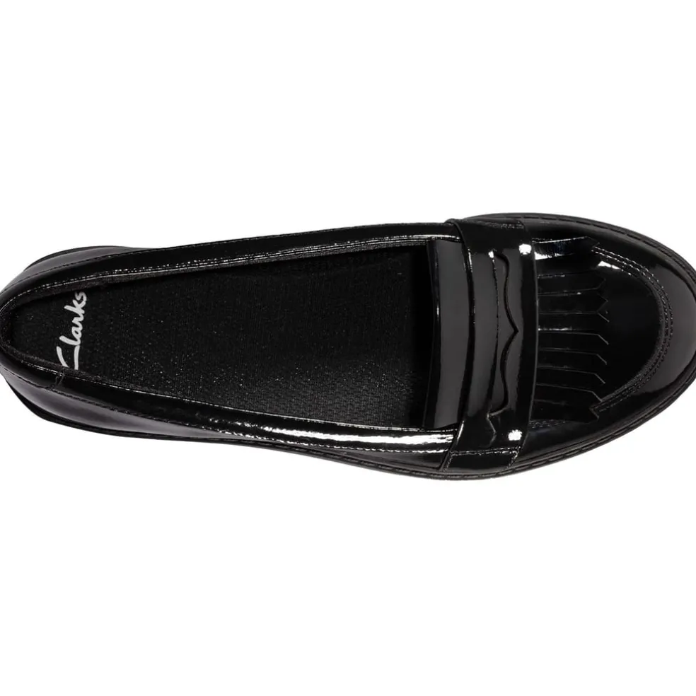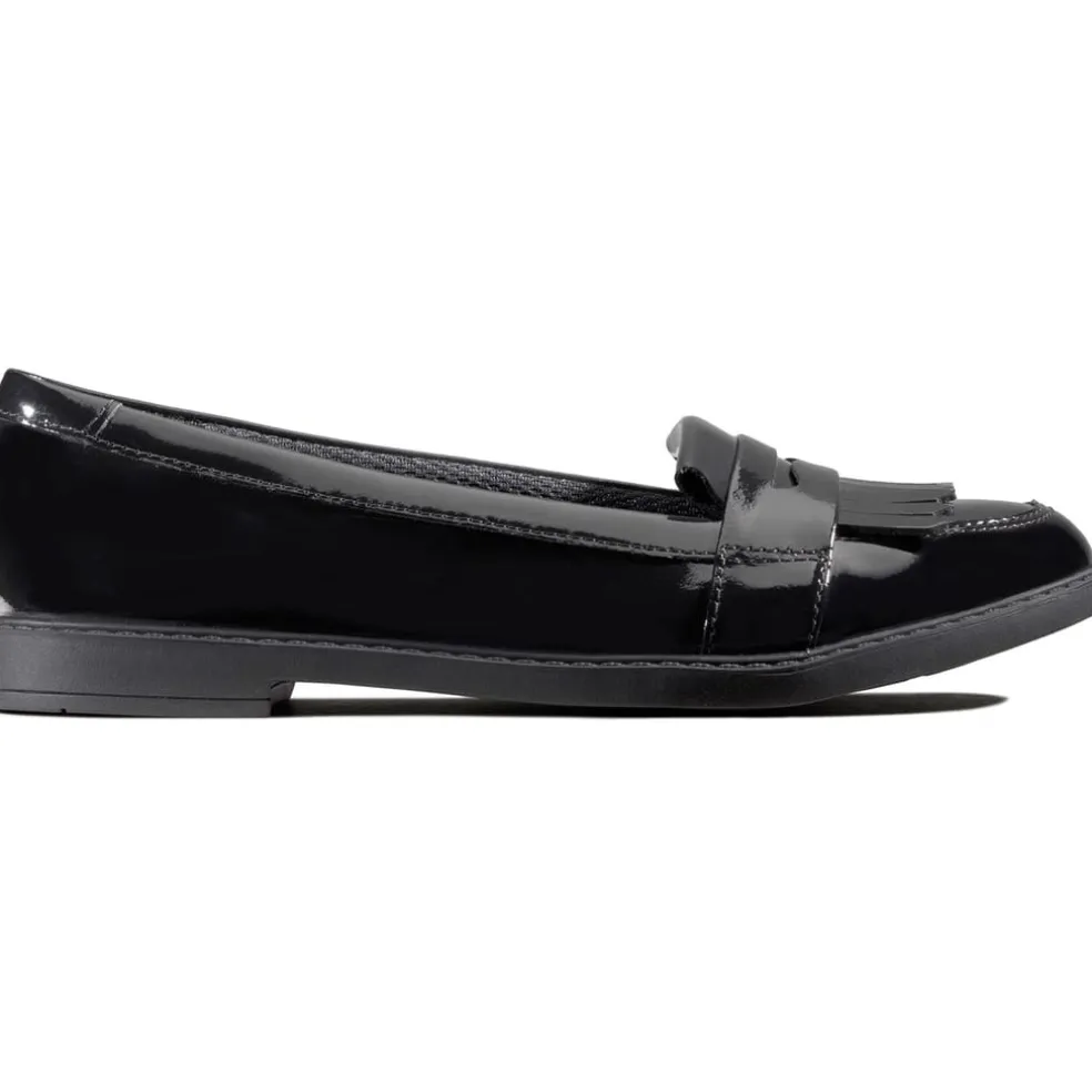 The Kids Clarks Scala Bright Loafers are perfect for heading back to the school, featuring a slip on design with a cushioned insole and a moulded rubber outsole that ensures all day comfort. A patent finish along with tassel detail to the forefoot gives a smart and stylish look, finished off with the Clarks branding.