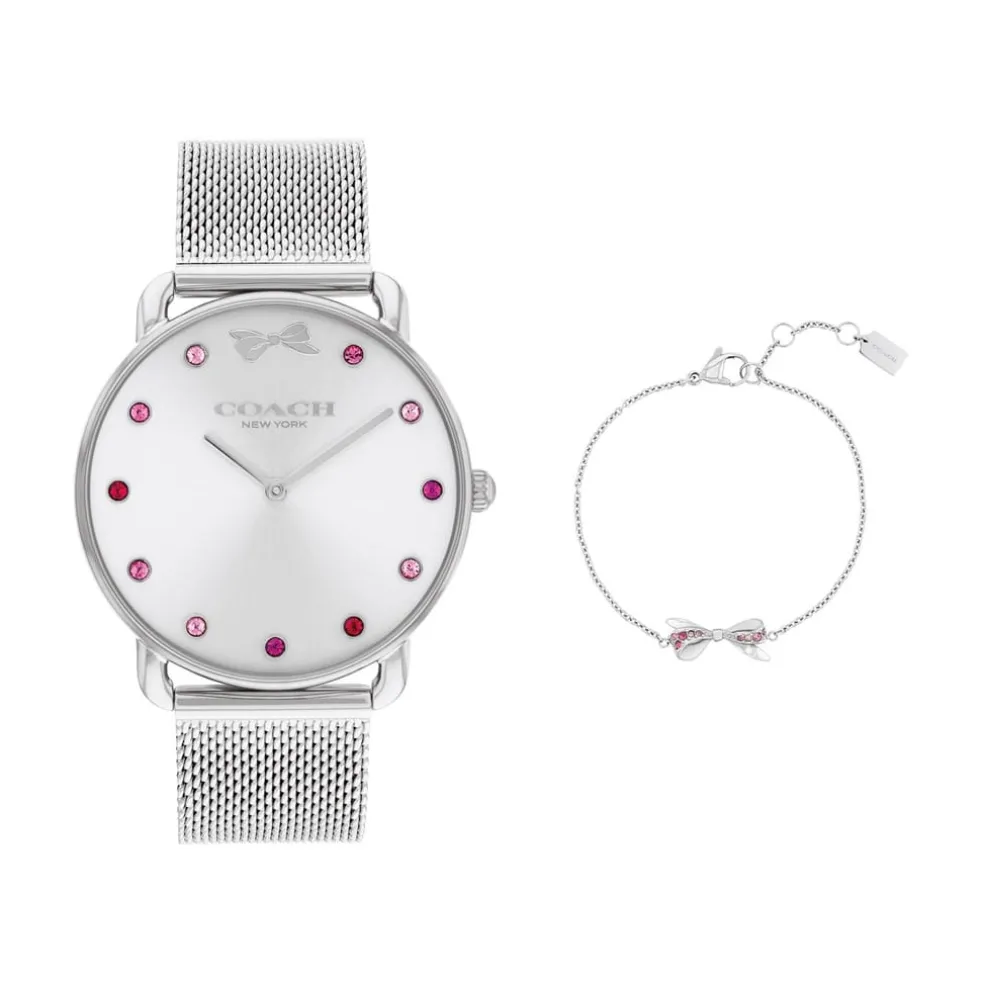 Ladies Coach watch and bracelet Elliot gift set. Featuring a 36mm stainless steel case with bow and crystal markers finished with a stainless steel mesh bracelet. Paired with a stainless steel bow detail bracelet.