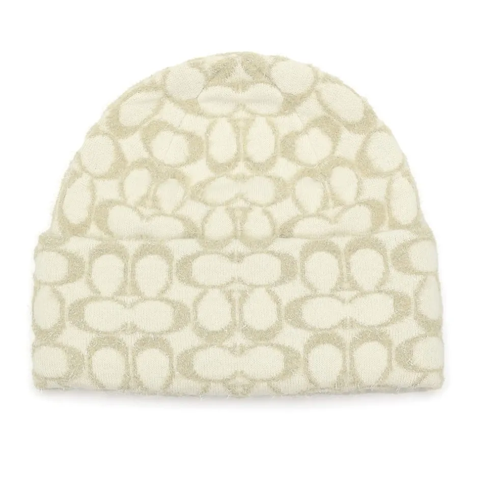 Metallic threads add a subtle shimmer to this cosy Coach Signature beanie. The cold weather style is crafted of a soft wool-blend.
