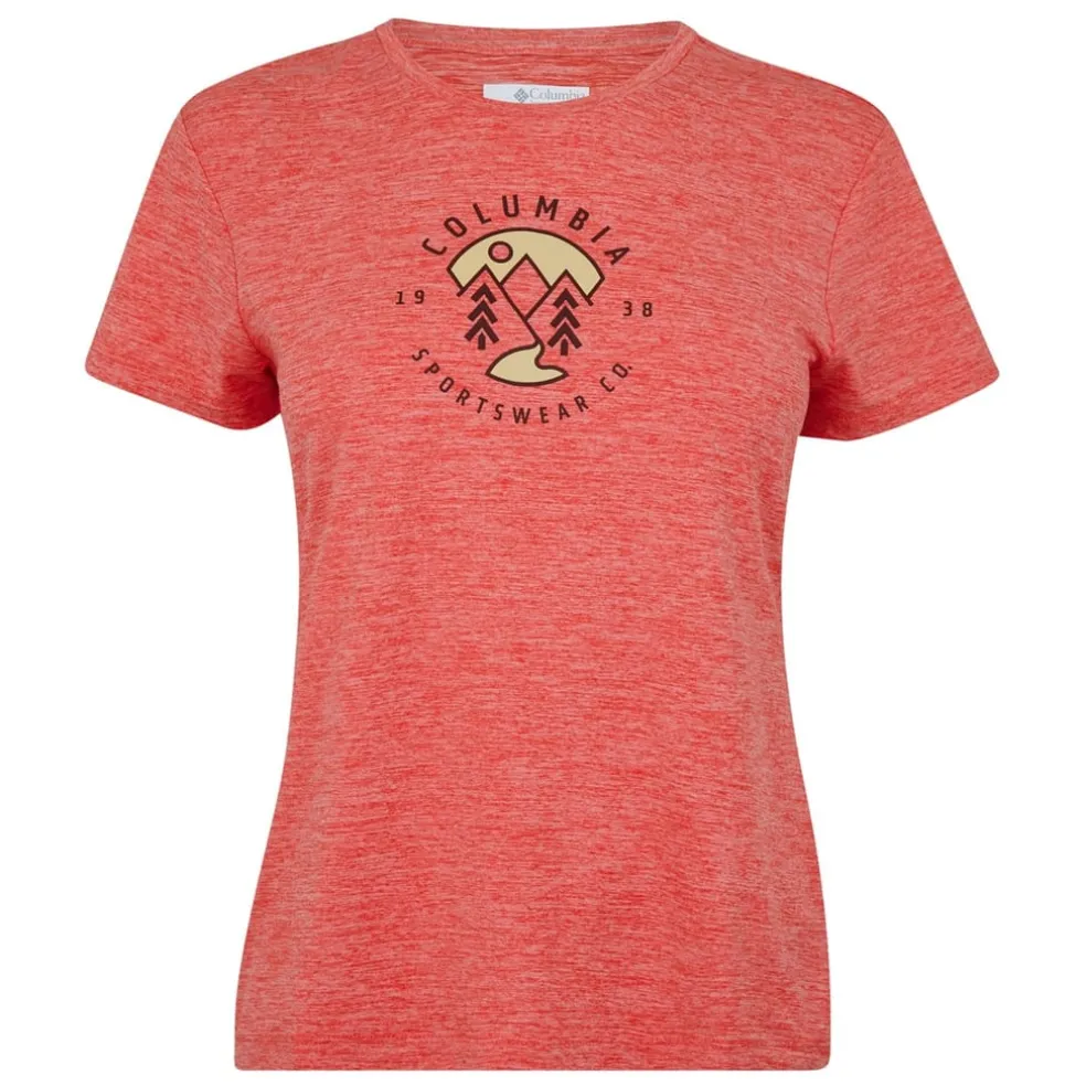 This Columbia t-shirt is a must-have for casual wear. Designed with short sleeves and a crew neck, it offers a regular fit for comfort. The solid and heathered patterns add a stylish touch, while the performance fabric ensures durability. Embellished with a logo, this top combines functionality with a sleek look.