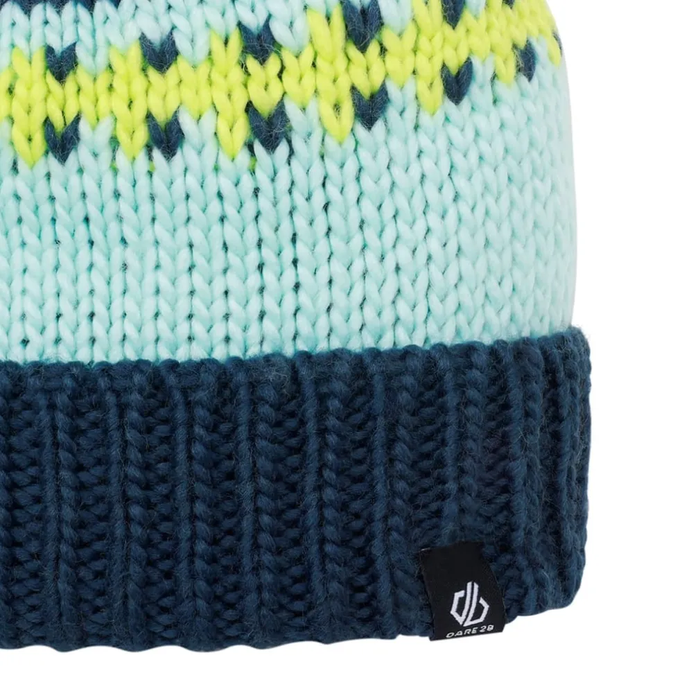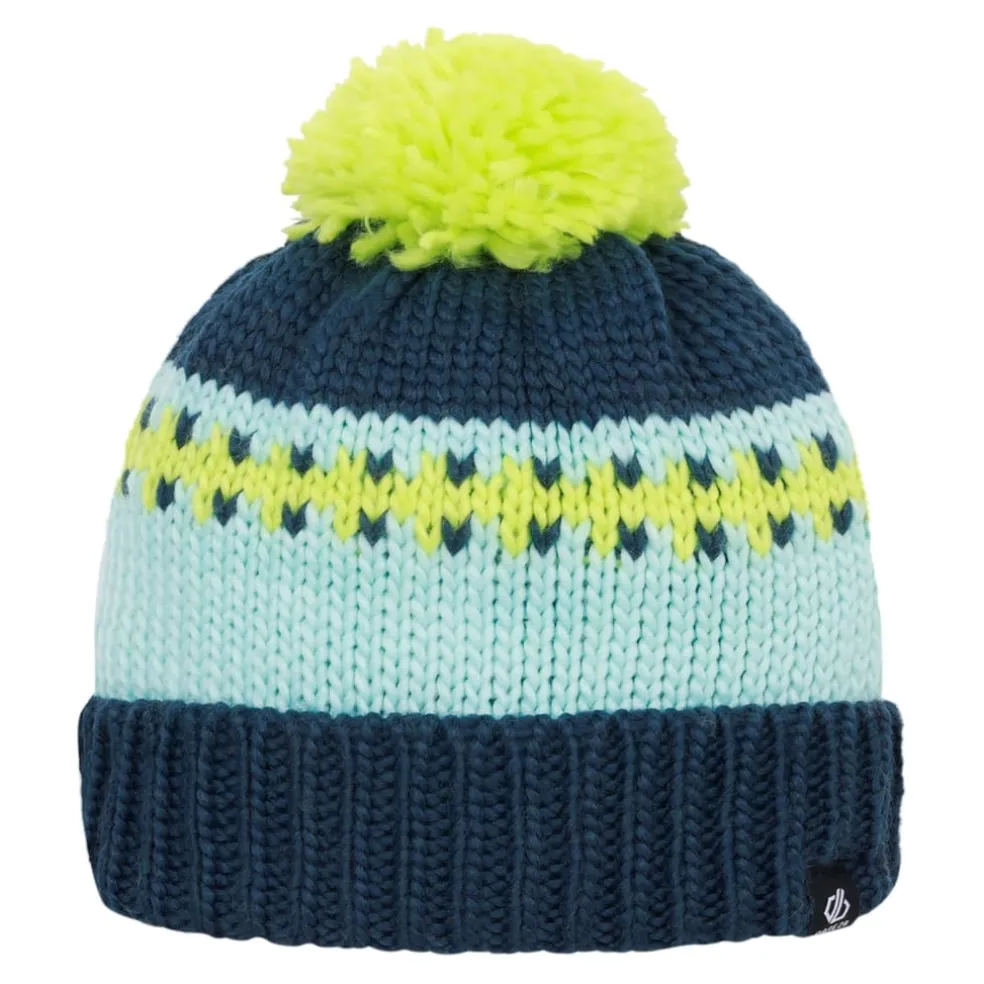 The Dare 2b Boffin II Beanie. Crafted from recycled polyester knit, this beanie ensures kids stay warm in winter climates. Its soft fleece lining offers additional insulation and provides a soft, cosy finish. It’s finished with a playful bobble.