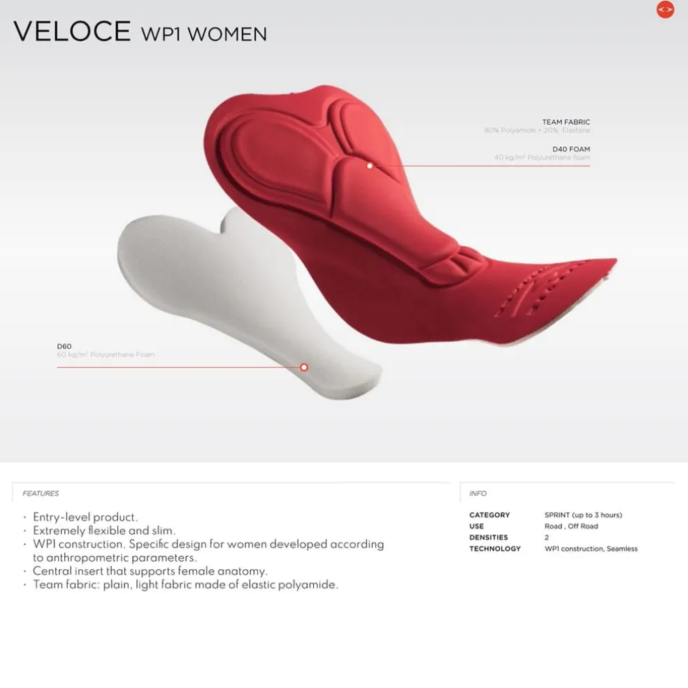 – Veloce Women has an advanced design, larger central inserts for better perineal coverage and softer wings throughout the inner leg area.