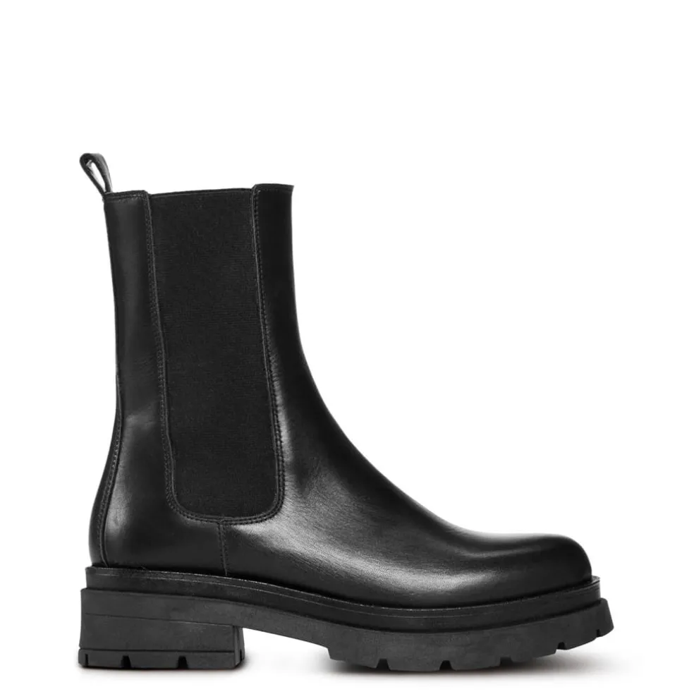 In a modern calf-high silhouette, these leather boots detail a solid block colour to the outer silhouette with elasticated panels to the side for a comfortable fit. With a chelsea boot style, these everyday staples are sat upon a durable synthetic sole with a pull tab to the upper for an easy fit. Pair with a knitted dress and tights for a transitional look that will see you through the colder months.