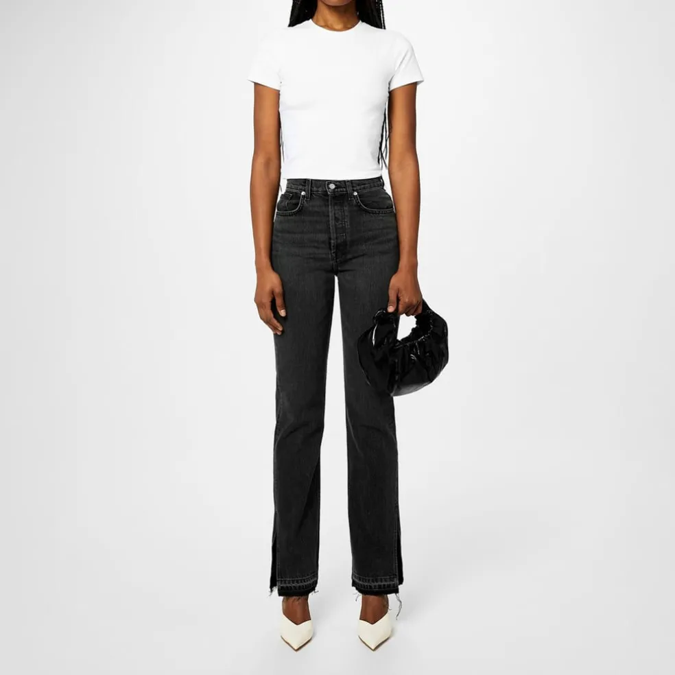 – The washed finish, distressed hem, and side splits give a unique and edgy look.