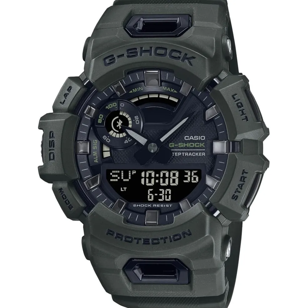GBA-900UU, the new Urban Utility colours from G-SHOCK G-SQUAD GBA-900 series. These models can measure distance using an accelerometer while linked with the GPS function of a smartphone via Bluetooth®, and once you have taken measurements with a smartphone, the next time you will be able to measure distance with the watch alone. You can also check your activity history by linking with an app running on your smartphone. The app also helps to simplify the configuration of watch settings and training management. A Super Illuminator keeps face information easy to read, even in the dark, and the band’s soft urethane material improves the fit to the wrist, and vent holes improve breathability. This watch connects with your phone via Bluetooth® to support auto time adjustment, phone notifications, step tracking, and other functions throughout the day. Battery life is approximately two years between replacements.