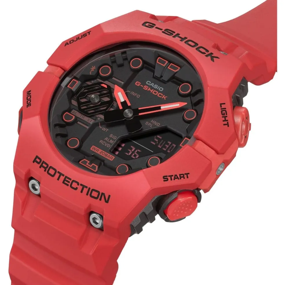 Introducing the new GA-B001 series from G-SHOCK -Featuring a new toughness-driven design and Smartphone Link functionality. With the GA-B001 and GA-B001G, Casio brings ingenuity to the exterior structure to achieve an integrated bezel and band construction in a shock-resistant watch which comprises two separate components that connect at the 9 and 3 o’clock positions.The molded construction follows the lines of the wrist, minimizing the space between the wrist and watch for an enhanced fit. These watches are all equipped with a Mobile Link feature for pairing with a smartphone via Bluetooth®. When used with the dedicated CASIO WATCHES app, the watch automatically adjusts to the correct time. In addition, the App information function sends notifications on the watch when the app receives updates on new products and other information. The GA-B001-4AER features a new shade of red, making it feel altogether different.