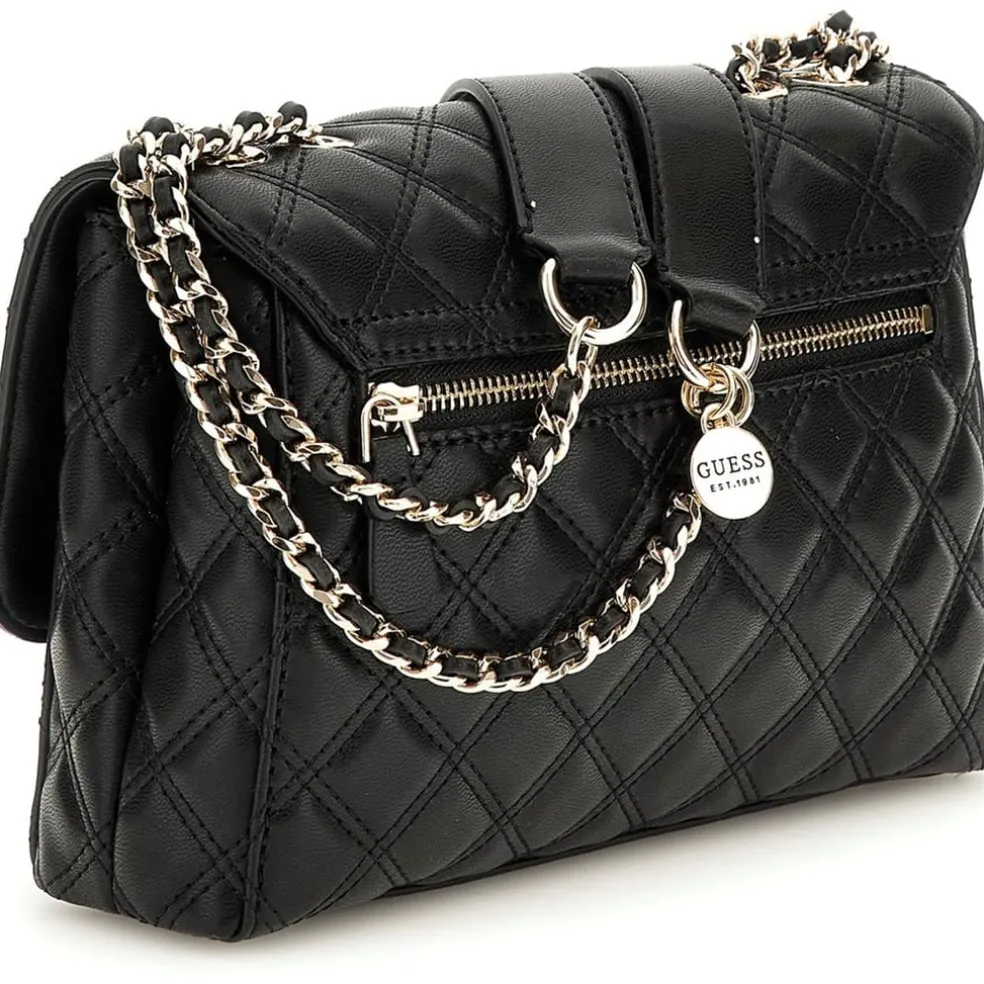 Discover the Guess cross body bag, a stylish accessory featuring a zipper and flap closure for added security. This shoulder bag is adorned with a chain embellishment and the iconic logo, making it a chic addition to any collection.