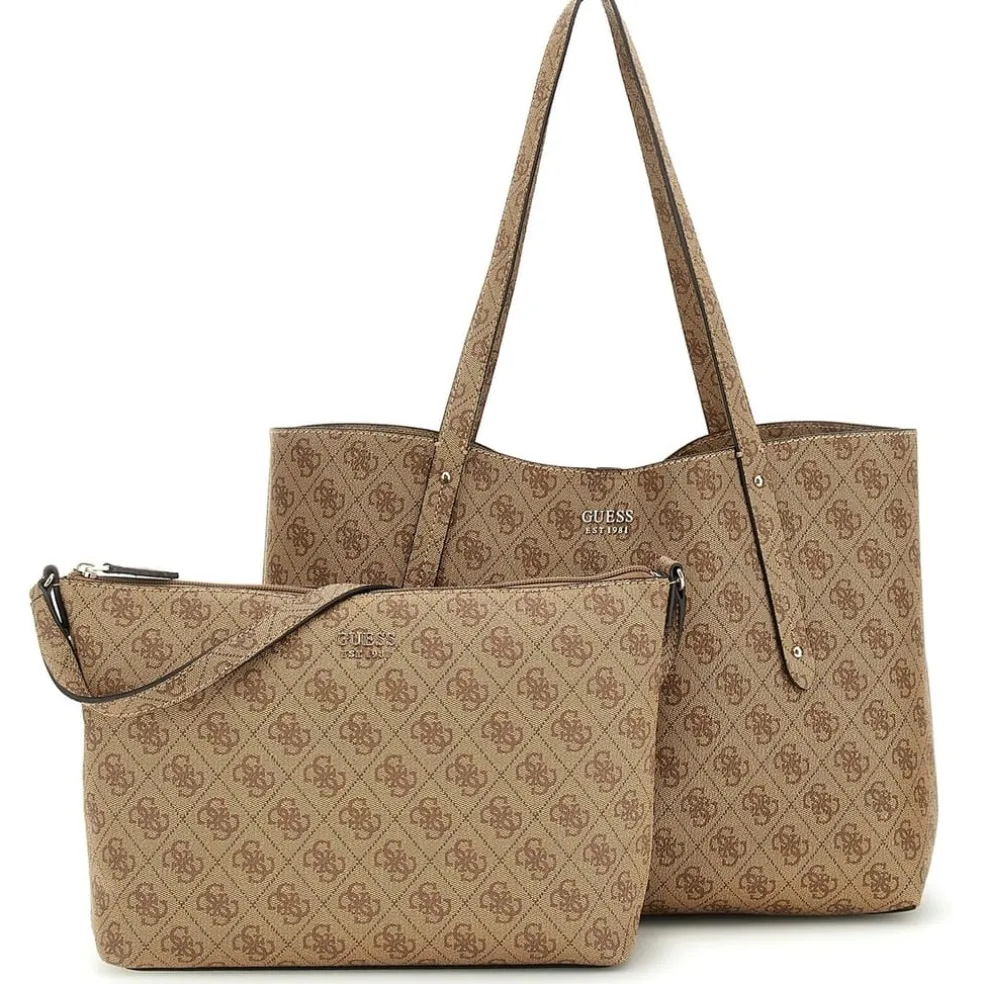 Discover the Guess tote bag, a stylish accessory featuring an all-over logo pattern. This shoulder bag is designed with a practical handle for easy carrying. The iconic logo embellishment adds a touch of brand recognition, making it a perfect choice for those who appreciate both fashion and functionality.