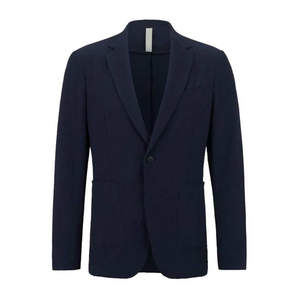 Notch lapels. Button closure. Welt chest pockets. Patch pockets. Kissing buttons on the cuff. Unlined. Slim fit.
