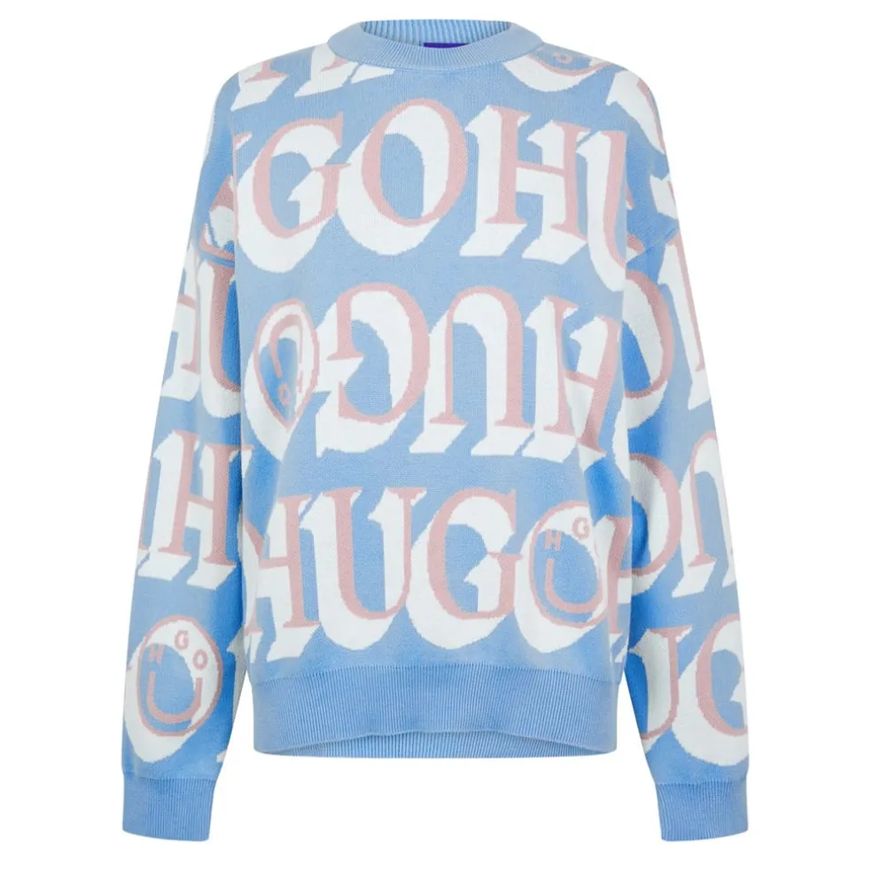 Discover the Hugo sweater, featuring a crew neck and long sleeves for a cosy fit. This regular fit design boasts an all-over logo pattern with ribbed cuffs and collar, adding a subtle touch of style. Perfect for adding a branded flair to your wardrobe.