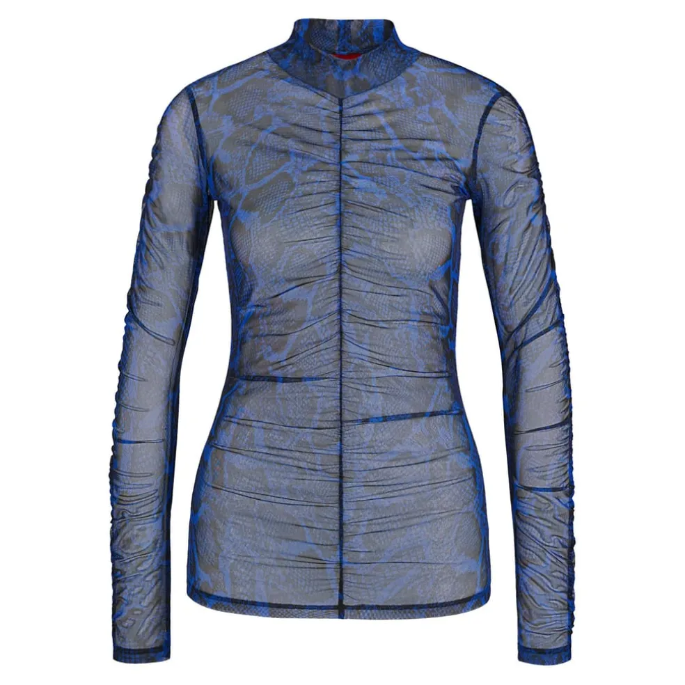 mesh longsleeve mockneck top / mid ruffle detail / logo print on neck / slim fit / 92% polyester, 8% elastane / hand wash