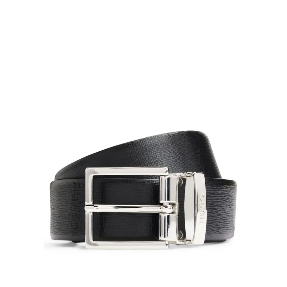 A reversible belt in Italian leather with smooth and structured finishes by HUGO Menswear. This 3.5cm accessory has a logo engraved on the keeper. A minimum of 60% of the leather used to make this product has been sourced from certified tanneries.