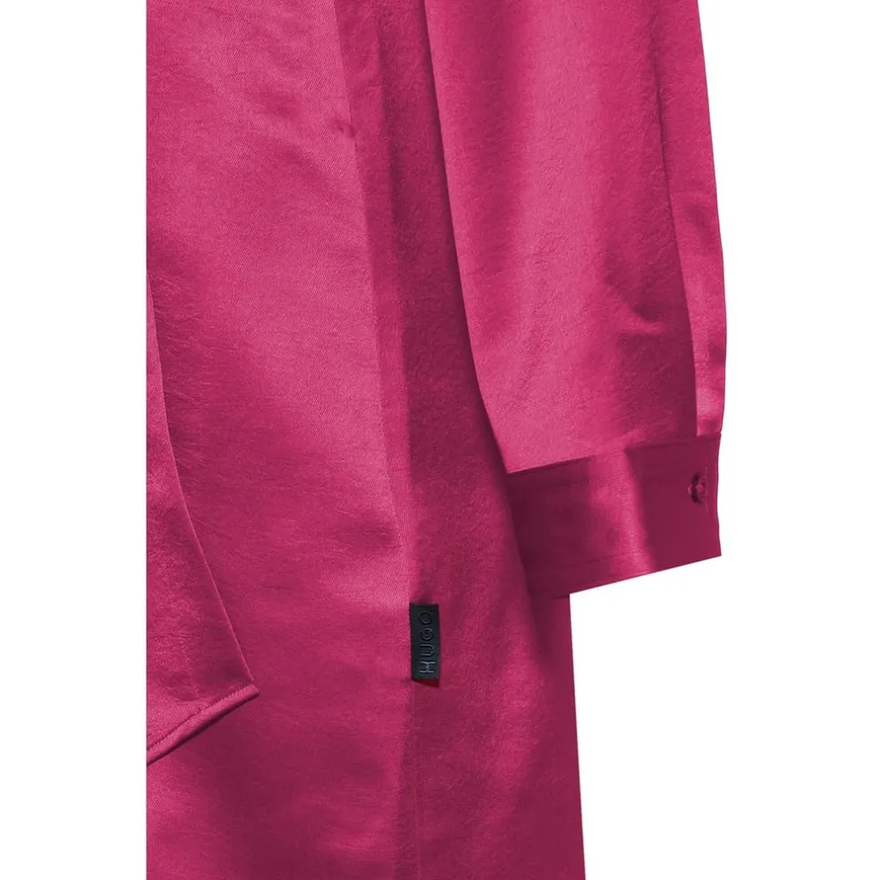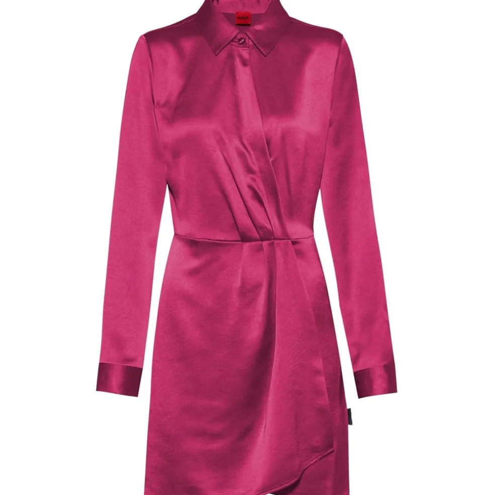 – Crafted from a luxurious recycled polyester blend, this dress exudes a satin finish for a touch of opulence. With its regular fit and waist-hugging silhouette, the Katharulla Dress subtly accentuates your curves. The mini length adds a youthful and trendy appeal, while the point collar with a single button fastening adds a timeless touch. The long sleeves with button cuffs add an extra element of style and versatility. One of the standout features of this dress is the flattering wrap front style, adorned with pleat details that effortlessly elevate your look, finished with the logo flag that is tastefully embroidered at the hem.