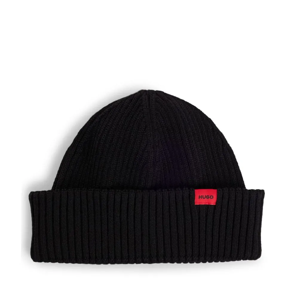 A modern beanie hat by HUGO. Featuring a red logo label, this accessory is knitted in a ribbed structure from soft and breathable yarns