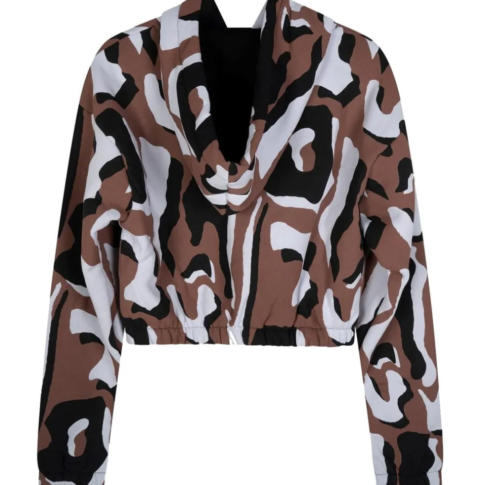 This Hype cropped top features a striking animal pattern, perfect for making a statement. Designed with a hood and a drawstring closure, it offers a relaxed fit for comfortable wear. The top is embellished with a practical pocket, adding a functional touch to its stylish design.