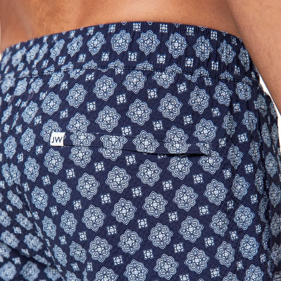 JW Baroque Swim Shorts are the perfect combination of classic style and modern functionality. Crafted from 100% Recycled Poly Seersucker, these shorts have a textured base, enhancing their visual appeal. These mid-length swim shorts are designed with a 16cm inseam length, providing a fit that is both comfortable and stylish. Featuring an internal mesh brief and an elasticated waistband with a drawcord, offers added support and comfort. The branded trims throughout add an extra touch of premium quality. With welt pockets at the side seams, a secure zip fastening pocket at the back and a coin pocket, these swim shorts provide ample storage space for your essentials. The all-over baroque print adds a touch of sophistication and makes a statement by the poolside. The Jack Wills branded embroidery at the hem completes the look with a signature touch.