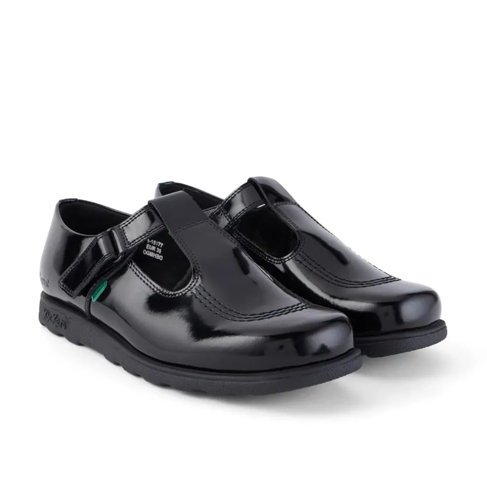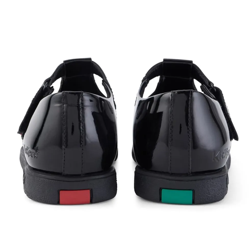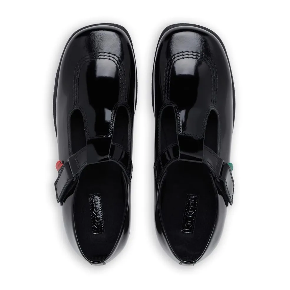 Meet the must-have school shoe of the season, it’s the Fragma T-Bar. Crafted in black patent leather for the ultimate shine, this shoe nods to all those that came before it with a classic silhouette, promising to never go out of style. A school fave, it fastens up with a hook and loop fastening and has a lightweight outsole to keep little toes running around all day. Keeping it Kickers, you’ll notice they have our signature triple stitch detail, branded tabs and logo at the heel.