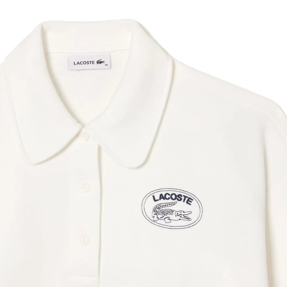 This Lacoste top features a relaxed fit with long sleeves and a drop shoulder design. The polo collar adds a classic touch, while the ribbed cuffs ensure a comfortable fit. The solid pattern is complemented by an embroidered logo, offering a subtle yet stylish embellishment.