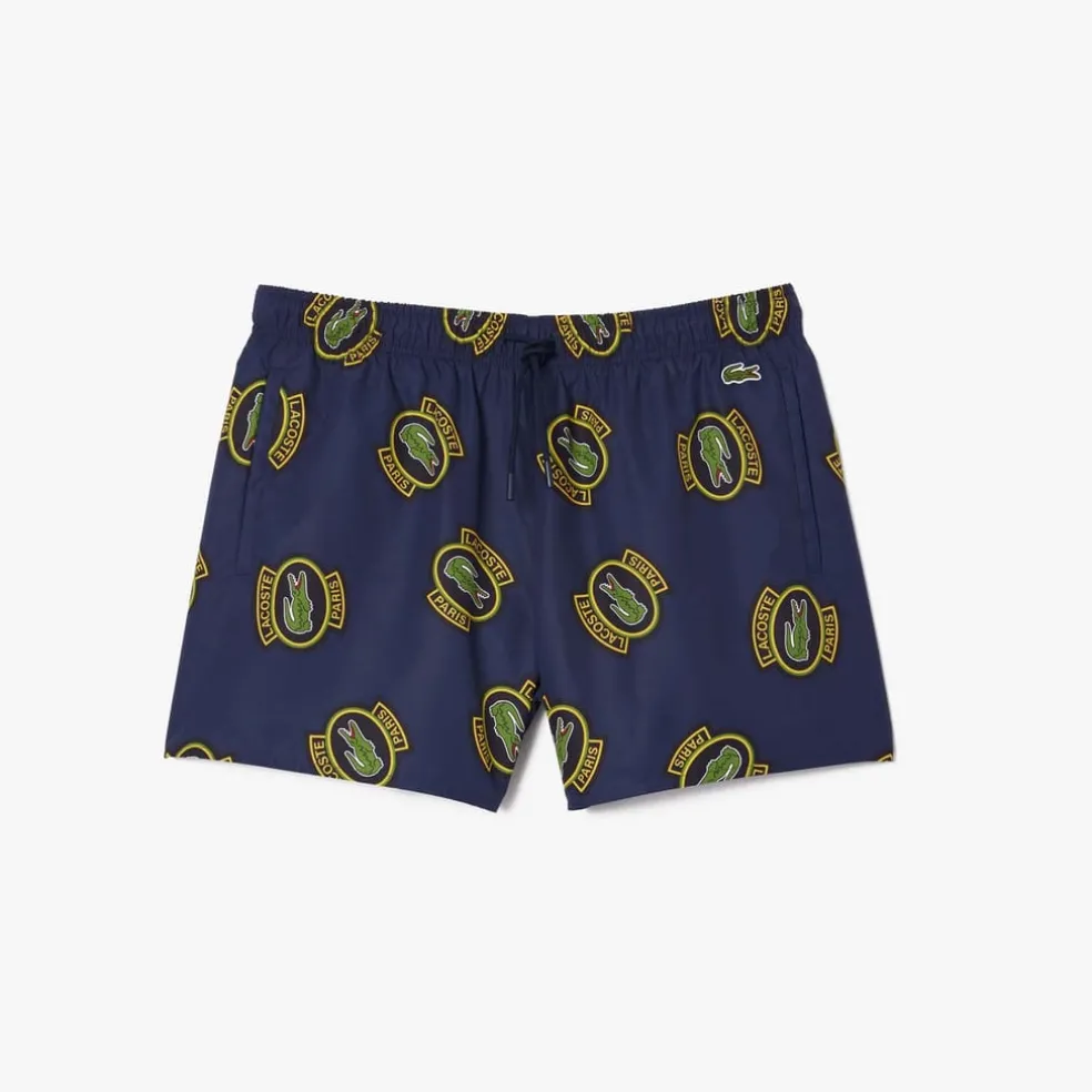 Short Printed Swim Trunks Recycled polyester made from manufacturing offcuts Length: mid-thigh 3pockets Sold with matching swimming bag Embroidered crocodile on front Short Printed Swim Trunks Recycled polyester made from manufacturing offcuts Length: mid-thigh 3pockets Sold with matching swimming bag Embroidered crocodile on front