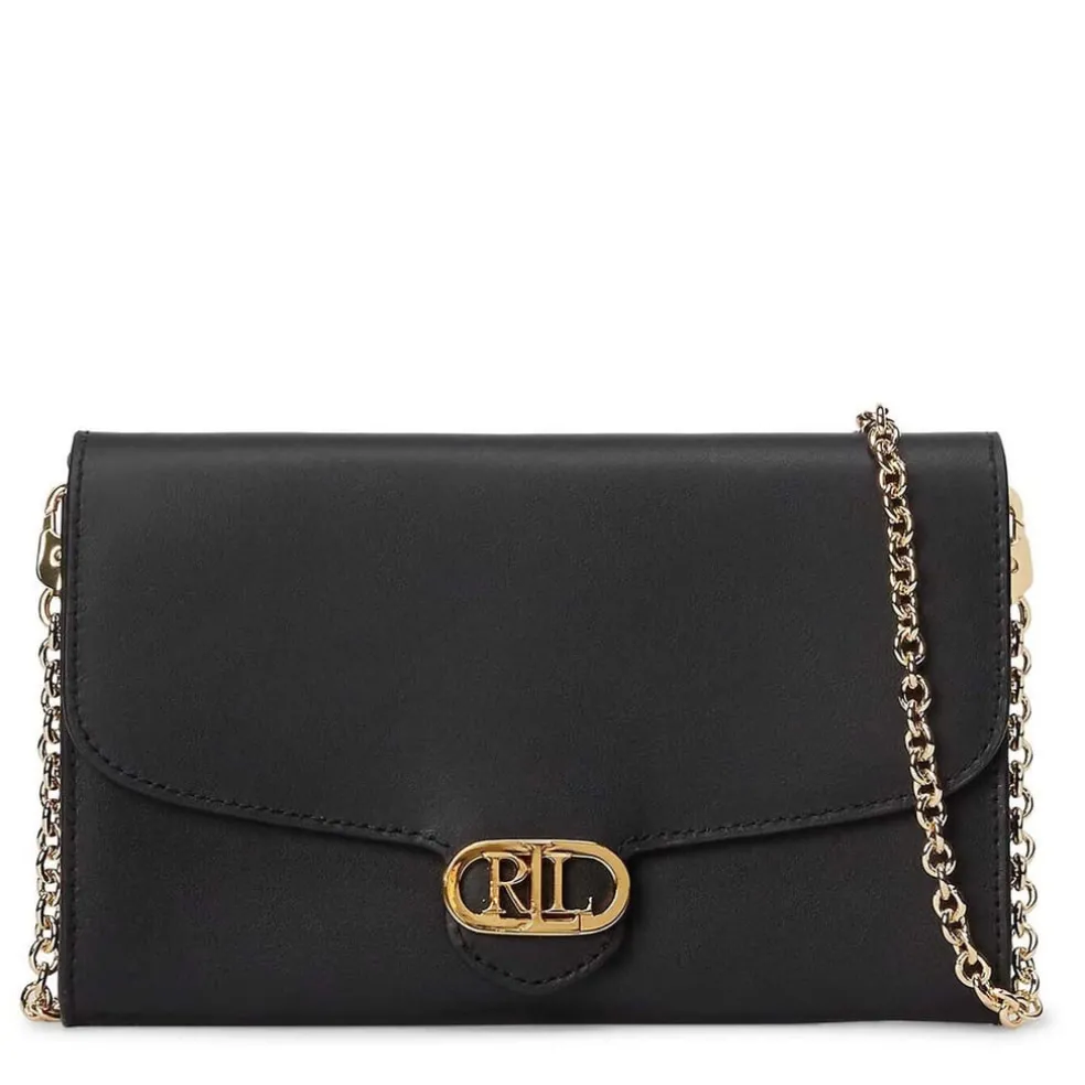 – Adding a stamp of exclusivity, the gold-toned LRL signature stamped to the fold-over lid elevates the clutch.