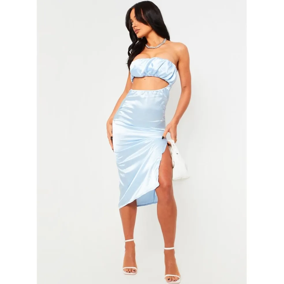 Dress to impress babe, in our Ruche Bust Cut Out Midi Dress. Featuring a ruched bandeau fit with cut out detail and a midi length. This satin number is super elegant and classy, perfect for them special occasions.