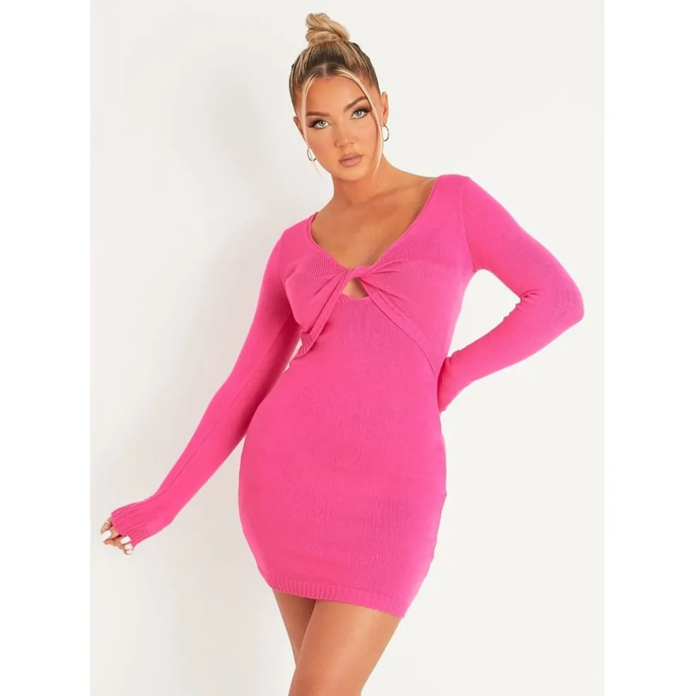 Missy Empire Sleeve Twist Front Knitted Mini Dress in Pink