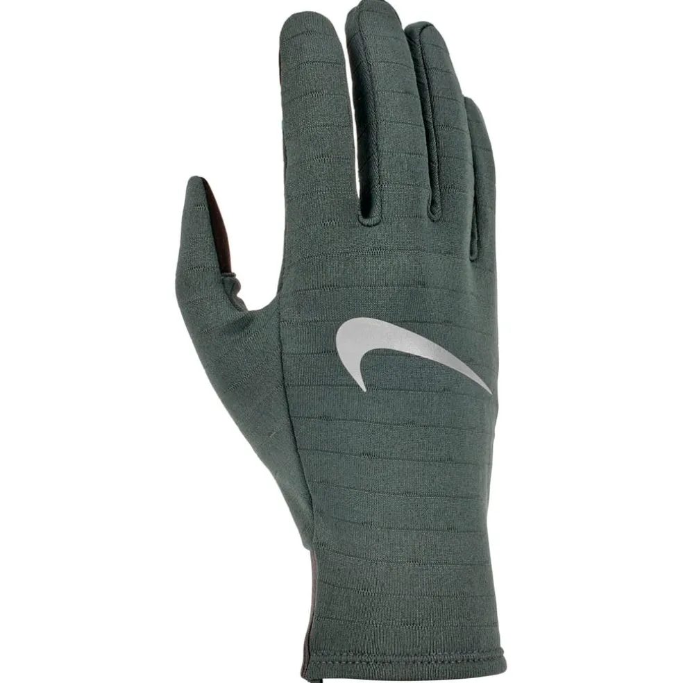 Innovative structure on the palm and fingers that follows the natural movement of the hand while running.Thumb and index finger compatible with touch screen.Brushed interior.Ribbed elastic insert.Reflective Nike logo.Nike Therma-FIT technology helps manage your body’s natural heat to help keep you warm in cold-weather conditions.Touch screen-compatible thumb and forefinger keep you connected on the go.Fitted cuff helps to keep warmth inside the glove.