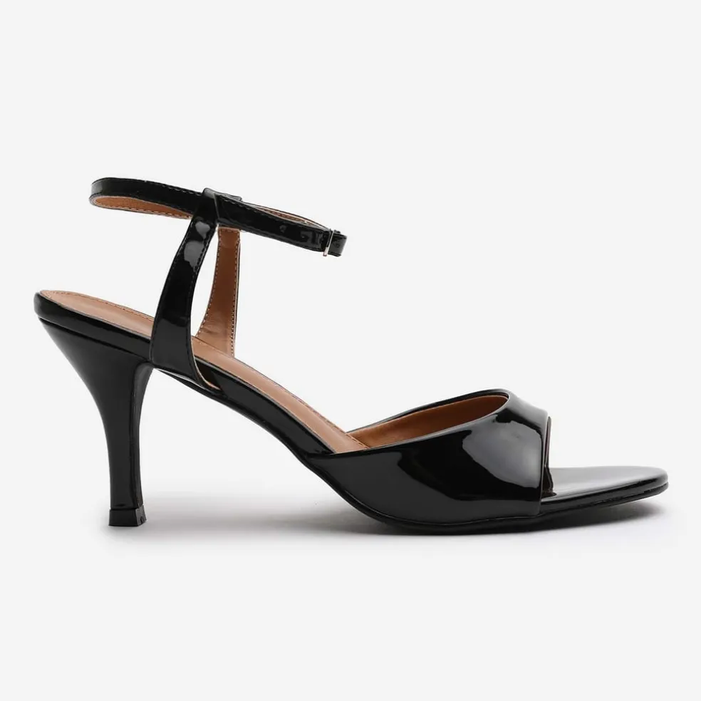 Synthetic upper.Buckle fastening.Open toe.Mid heels.