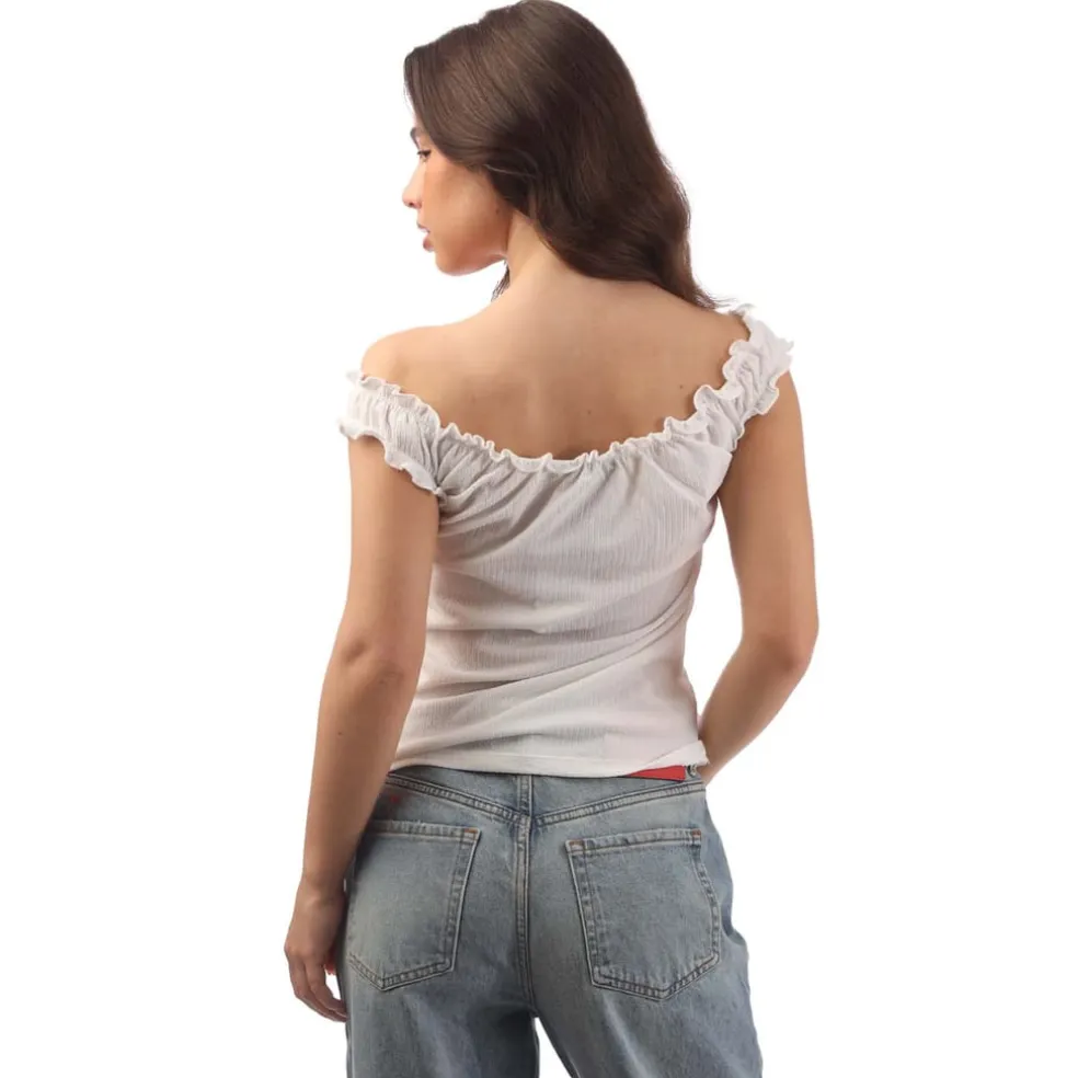 Say hello to Savannah. Made from recycled materials, this white Bardot top has been blended with a touch of stretch to keep the off-the-shoulder cut in place all day long. With frilled trims, she’s detailed too. Style yours with denim.
