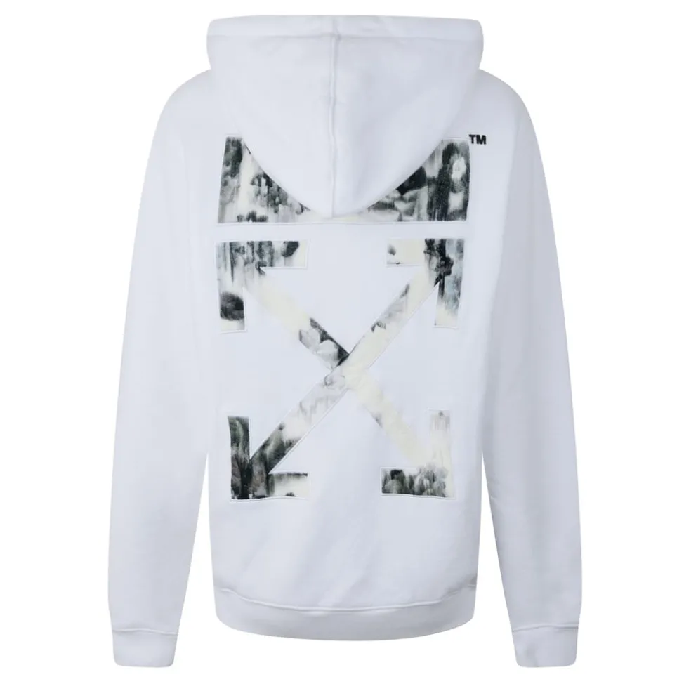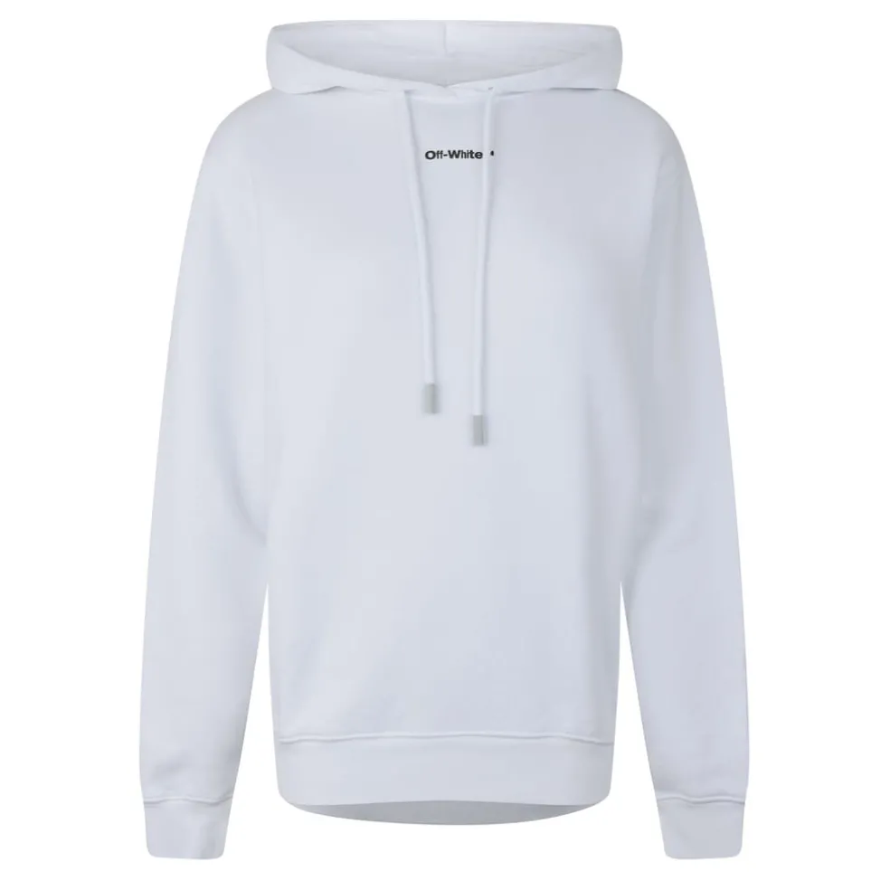 The Off-White sweatshirt features a hooded neckline with a drawstring closure, offering a stylish blend of comfort and fashion. Its long sleeves and regular fit ensure a relaxed wear, while the ribbed cuffs add a touch of detail. The graphic print pattern is complemented by a logo embellishment, making it a standout piece in any casual wardrobe.