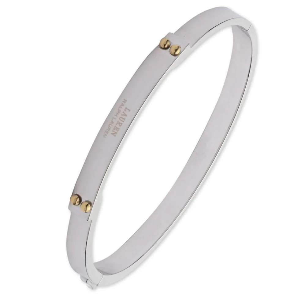Lauren Ralph Lauren presents a a silver-plated bangle fastened with a hinged clasp and adorned with LRL logo engraving and gold-toned trims for a bold yet minimal appeal. Ideal for layering and stacking with other Lauren Ralph Lauren bracelets and bangles for a unique, custom style.