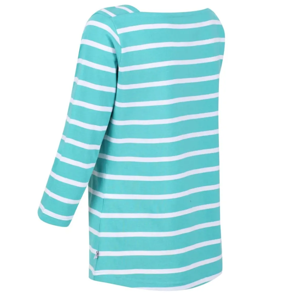 “The Polexia women’s top from Regatta is soft, breathable and stylish.The women’s 3/4 sleeve top is made with breathable and soft Coolweave cotton, to keep you fresh and comfortable. The top features many trendy touches including a stripe print, fashion neckline and side vent detail. Wear with trousers and sandals.”
