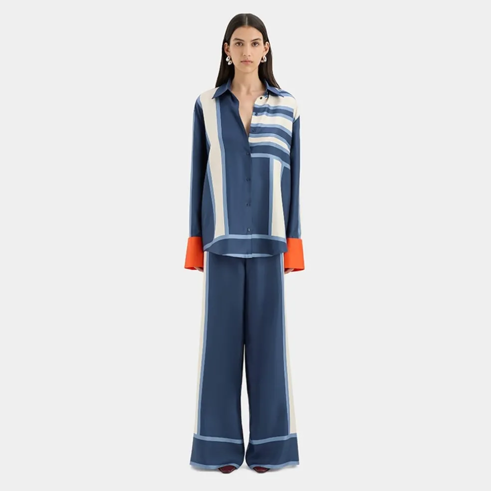 A repeat silhouette cut in our exclusive SIR. Studio print. Constructed in a lightweight silk twill. Designed with an asymmetric button feature. This long sleeve shirt is perfect to pair back with the matching pant for a complete look.