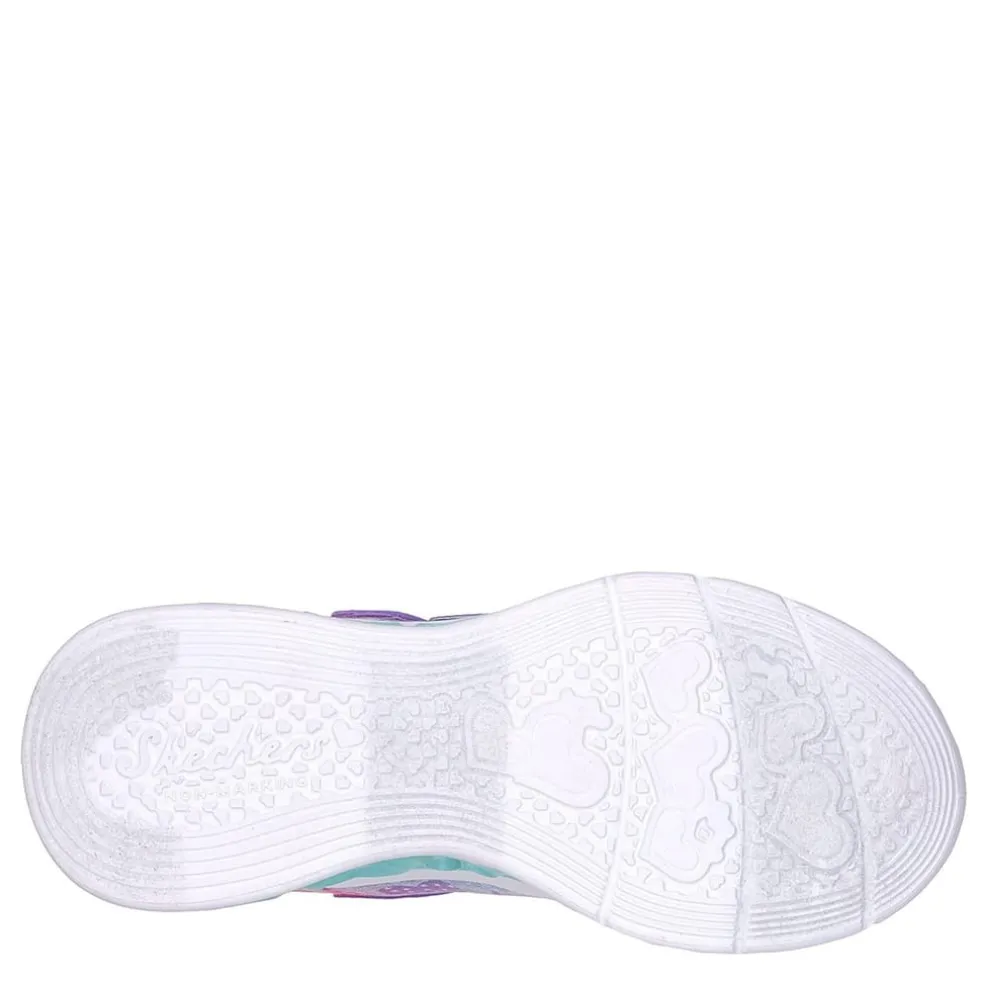 Refresh your little one’s footwear rotation with this vibrant addition. This casual lightweight shoe is constructed from shock-absorbing cushioned midsole with heart details, soft fabric shoe lining and cushioned comfort insole with flexible rubber traction outsole. The pair feature Velcro, lace-up fastening, sequin embellished fabric and glitter synthetic upper with a light-up midsole. The look is completed from the iconic Skechers logo embroidered on the upper and branding on the heel.