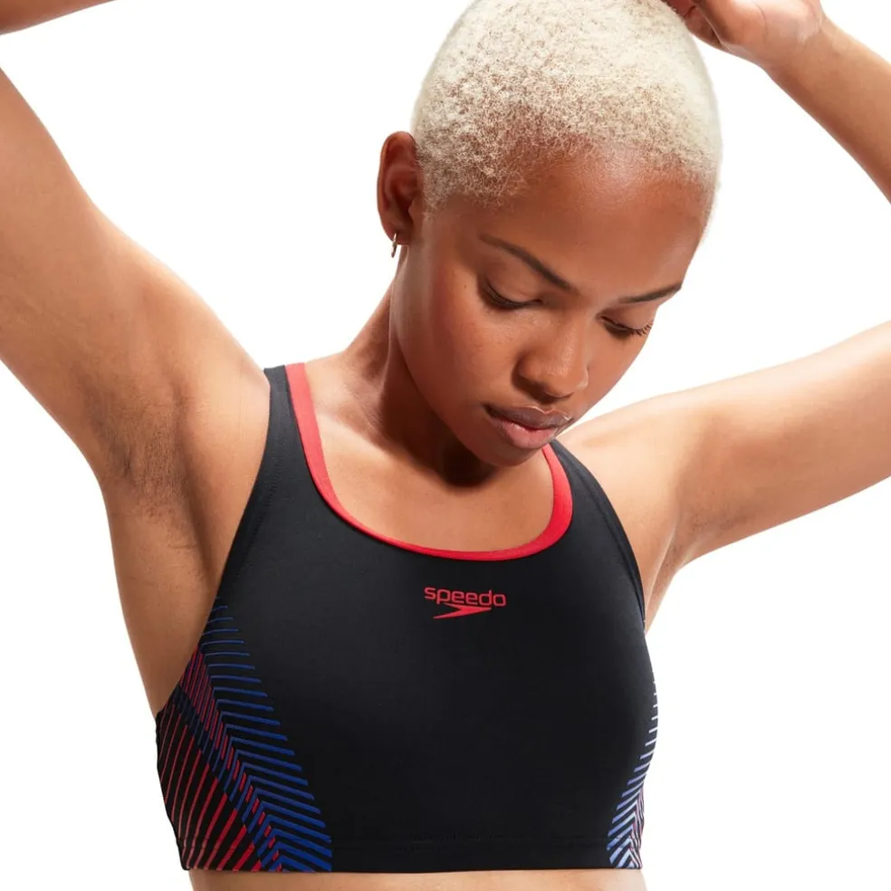 Hit the swimming pool in style this summer with this Speedo Placement Bikini Set. Crafted from Speedo’s groundbreaking ECO Endurance+ fabric, this bikini boasts a stylish, soft and sustainable feel keeping you comfortable and confident as you cut through the water. Featuring 100% chlorine-resistant and quick-drying material, it promises long-lasting performance swim after swim. Sporting a dynamic curved graphic design in striking red and blue, this tech-inspired, sporty 2-piece not only makes a statement but also offers unmatched functionality.