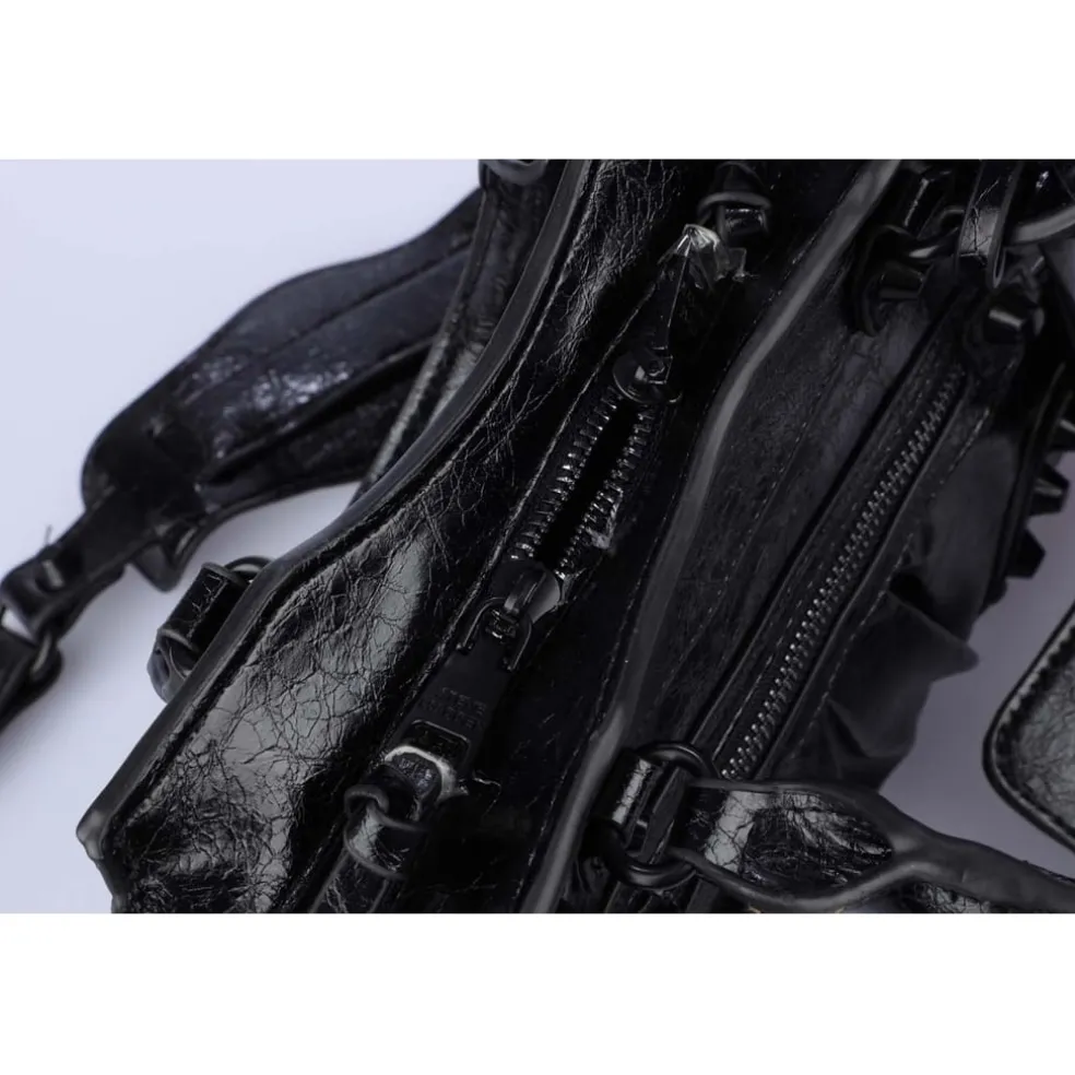 One zip pocket on the front.Zip pocket on the back.Closes with two-way zipper.Two handles.Removable and adjustable shoulder strap.Detachable pendant.Separate case.Inside:One main compartment.One zip pocket.One slip pocket.Separate case.