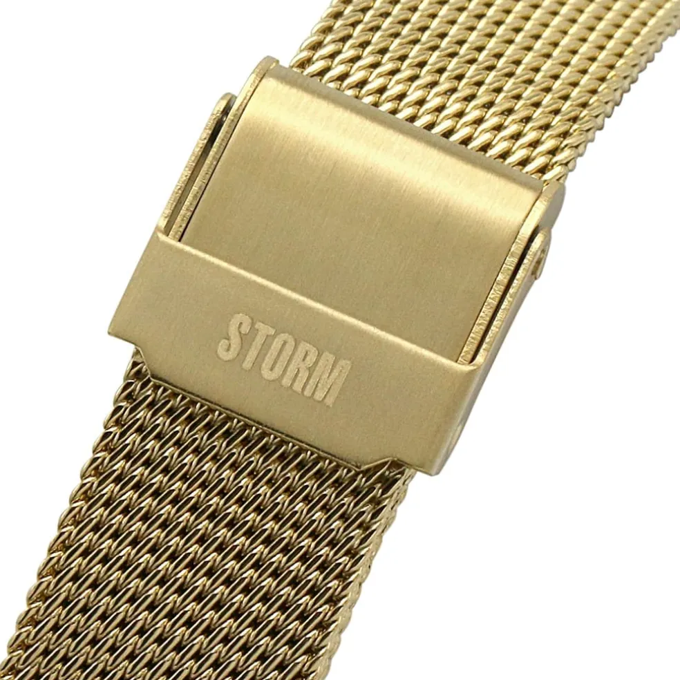 From our exclusive STORM London collection comes the STORM Selina Gold Ice: as cool as ice with metallics to match. The Selina features STORMs signature ice dial encased in a gold case. Minimalist in style, the beautiful face is accompanied by a delicate gold mesh strap. Simplicity and chic all in one. Rust-resistant gold-plated stainless steel case, delicate but sturdy mesh metal strap.