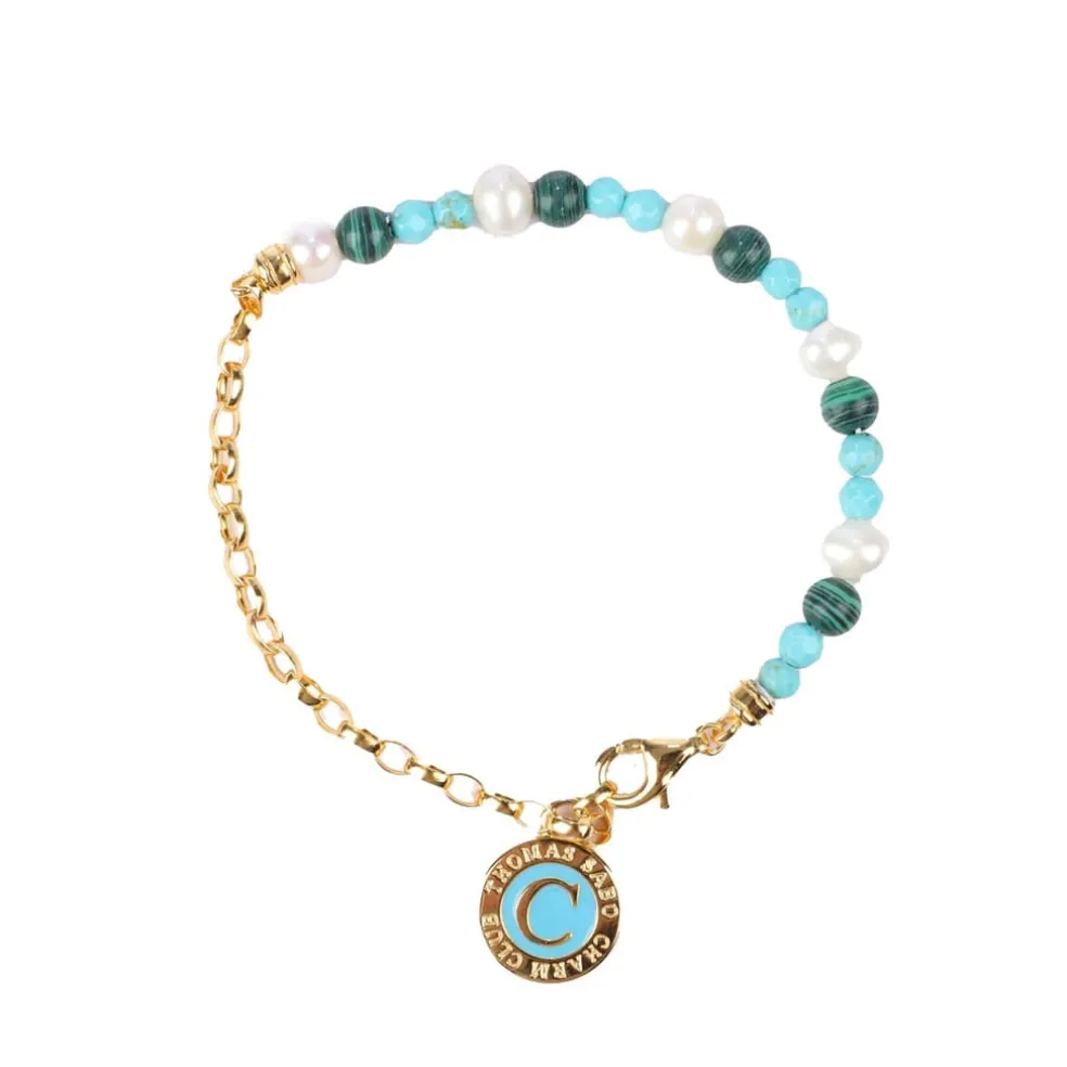 Charm bracelet with white pearls, malachite and disc gold plated