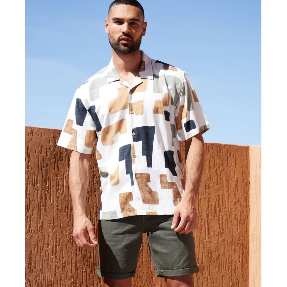 Discover the Threadbare top, perfect for summer with its relaxed fit and short sleeves. Featuring an abstract pattern and a button closure, this casual piece is adorned with a subtle logo embellishment, adding a touch of style to your wardrobe.