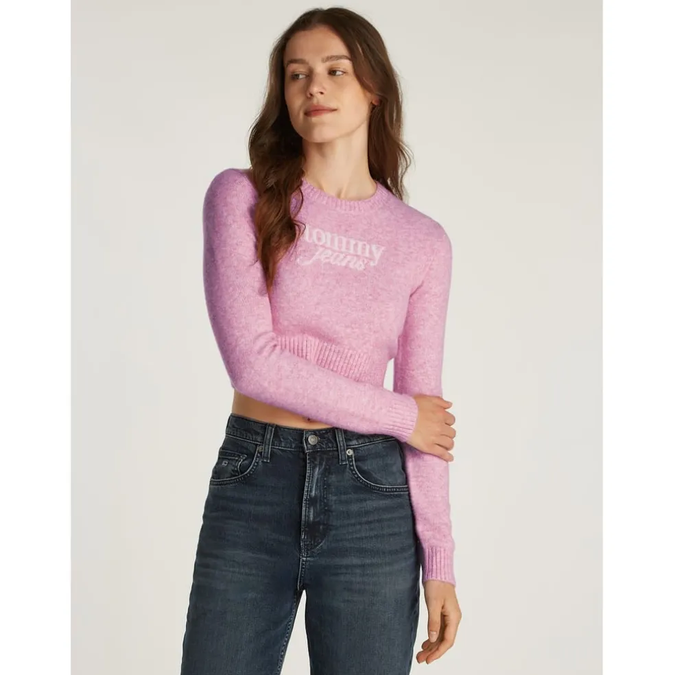 Tommy Jeans Cropped Script Slim Fit Sweater in Pink